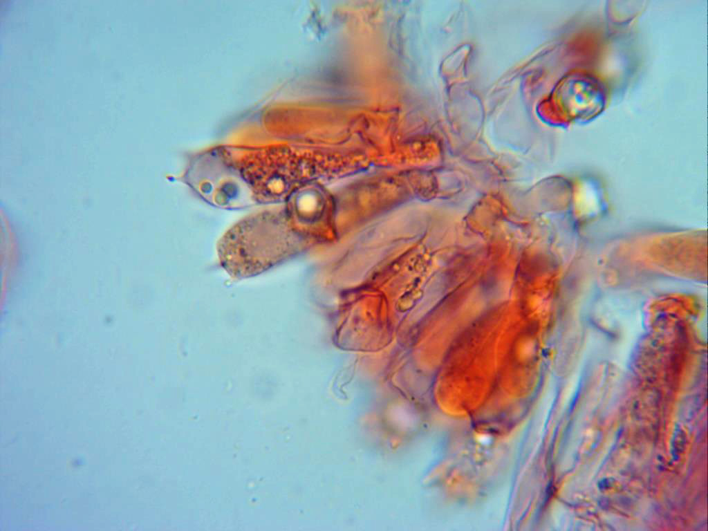 Detalle de las hifas de la pileipellis a 400 aumentos, pigmentadas sin fíbulas y de hasta 12 micras de ancho