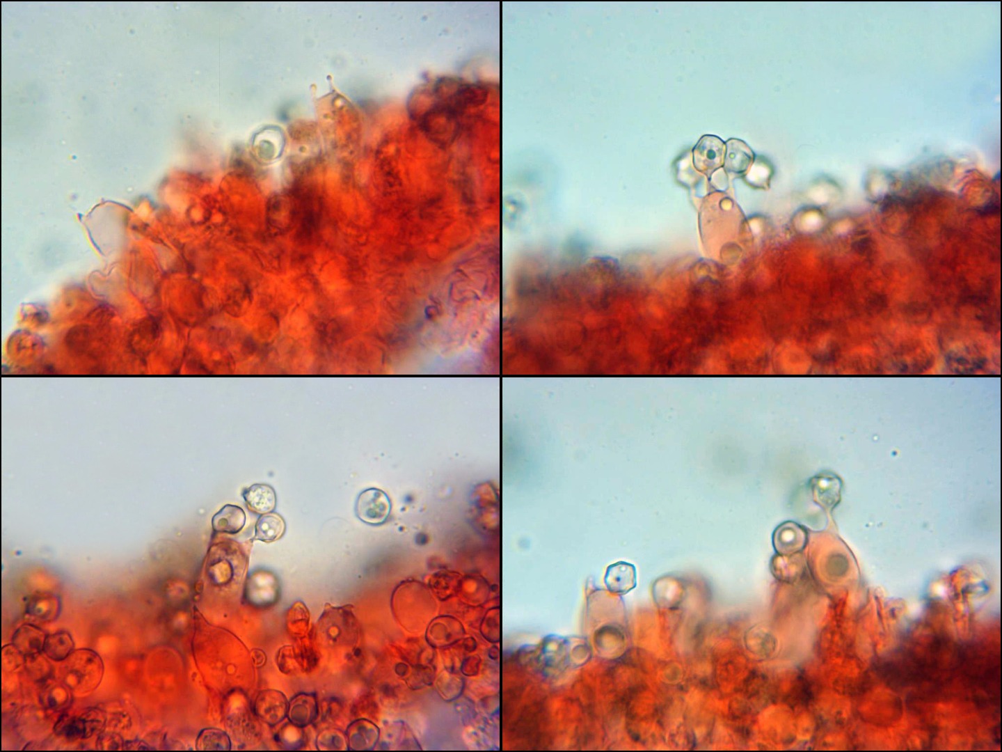 4 imágenes de la arista laminar, con abundantes basidios, no observé ningún cistidio, por lo que tengo que considerar que carecía de ellos.