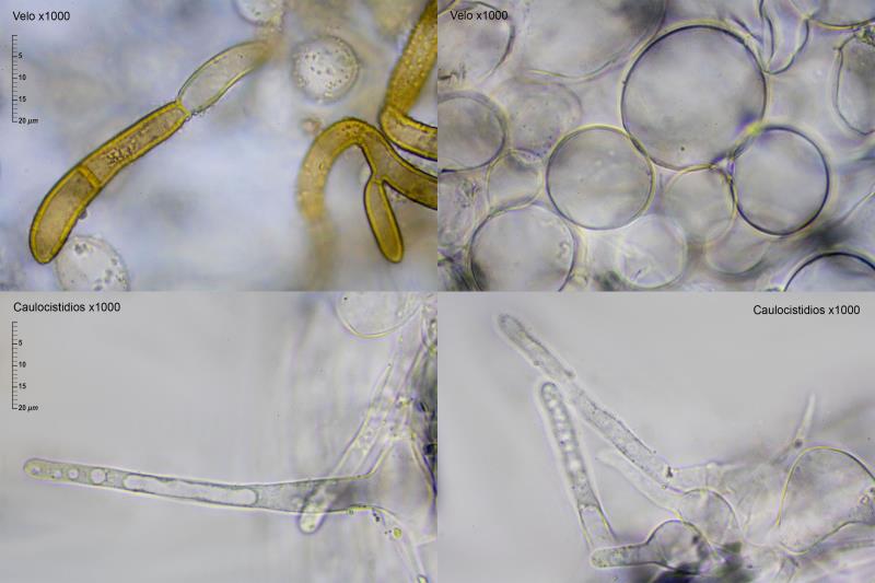 Velo constituido por elementos globosos blanquecinos y por cadenas fusiformes a globosas, de coloración pardusca.