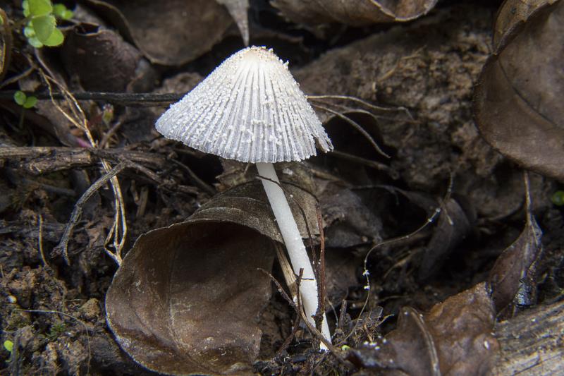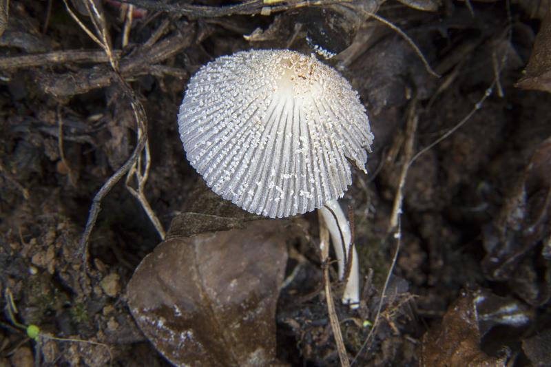 Un único ejemplar brotaba ayer entre la hojarasca, bajo diversos árboles planifolios, probablemente sobre una rama muerta semienterrada.. Sombrero de poco más de 15 mm de diámetro, blancuzco, estriado, recubierto de una fina pruina blanca, de color ambarino en el centro. Pie blanco, esbelto.