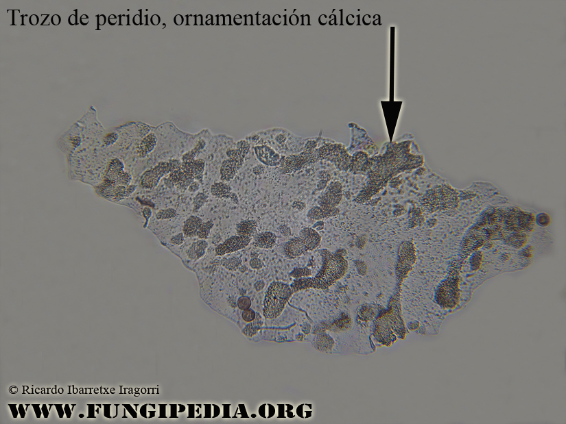 Macroscópicamente tiene un estipe delgado de color variable, desde el marrón rojizo hasta el amarillo pálido. La cabezuela que apenas se sostiene en el pie tiene forma lenticular y a veces presenta una pequeña depresión central. El peridio está ornamentado con incrustaciones cálcicas.