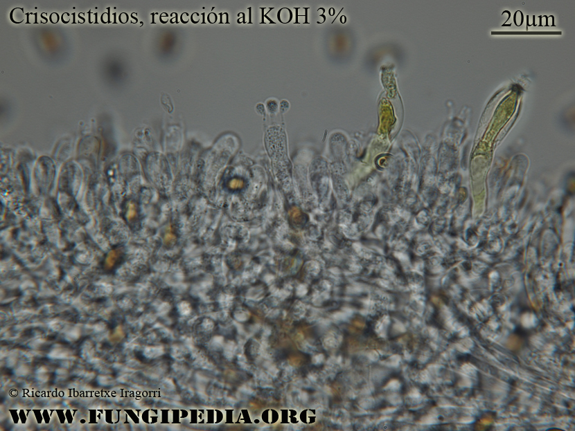 Subo una imagen que ilustra la reacción de los pleurocistidios (crisocistidios) al KOH.