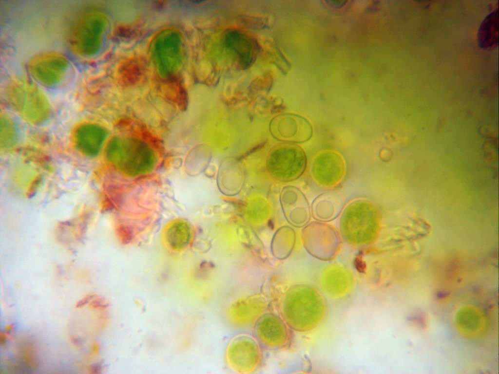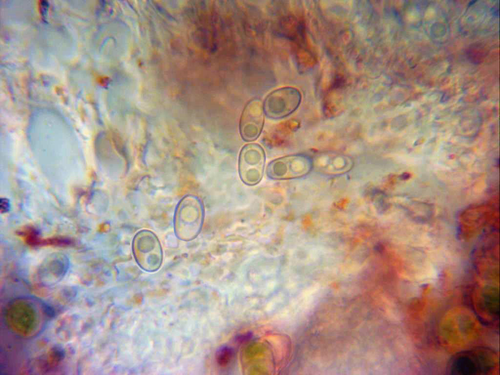 Esporas por lo general con dos vacuolas, elípticas y en mis mediciones de 9,6;10,2 X 5,5;6,9 micras.