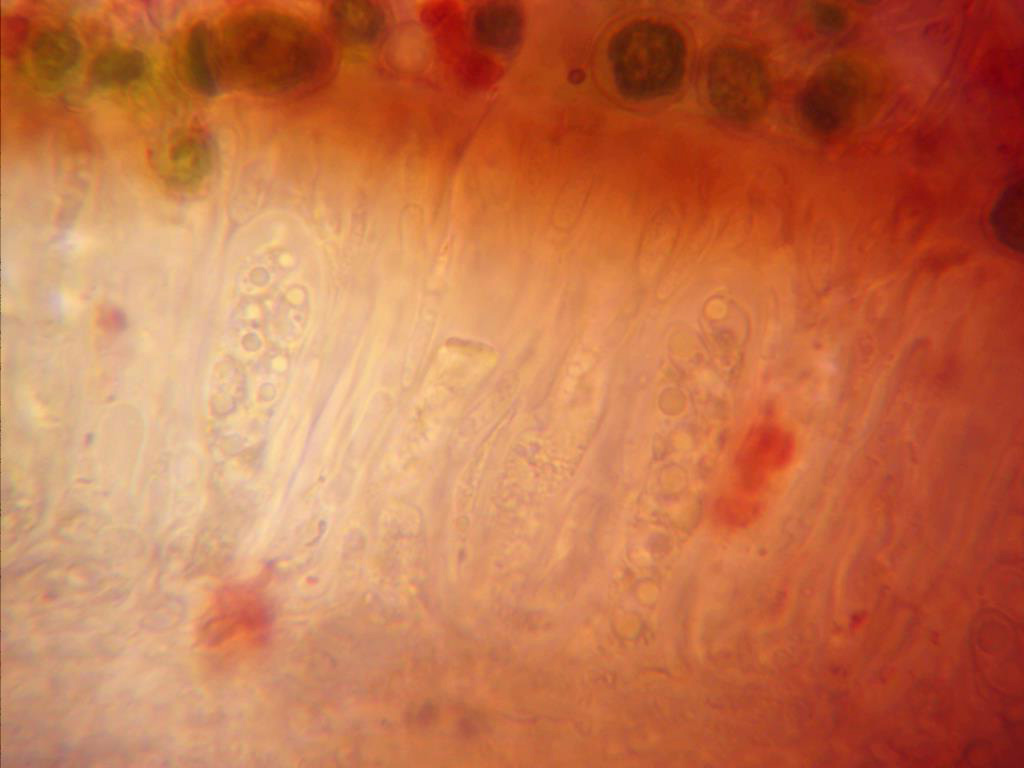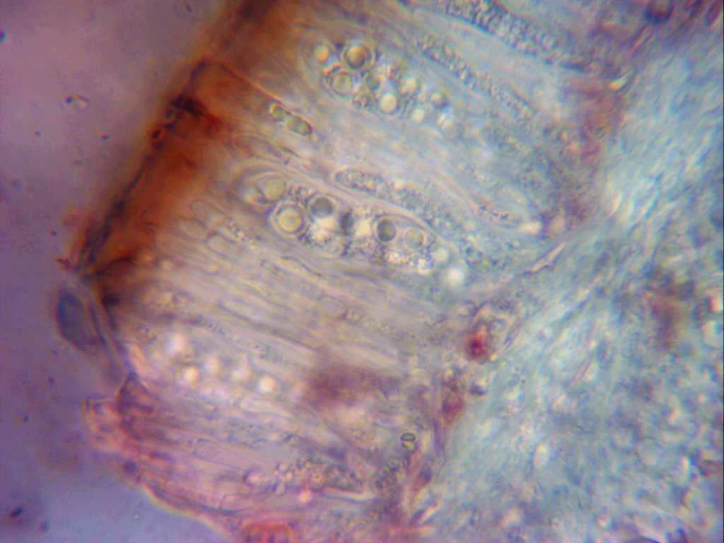 Ascas con las ascosporas en su interior, la medida de las ascas de 40,9;47,4 X 11;11,4 micras.