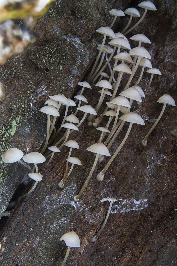 Especie recolectada la semana pasada en San Claudio. Numerosos ejemplares brotaban agrupados en el hueco vacío de un tronco muerto de Castanea sativa. Muy complicado de fotografiar: hueco estrecho, poca luz, sin espacio para el trípode… En fin: hicimos lo que pudimos.