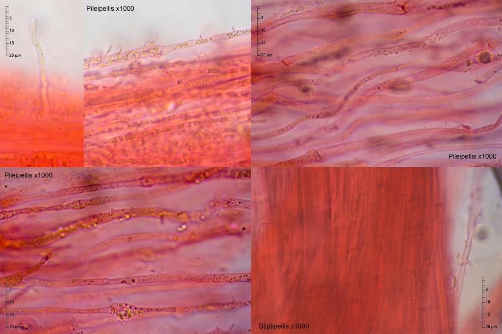 Stiptipellis: se observan puntualmente hifas con pequeñas excrecencias.