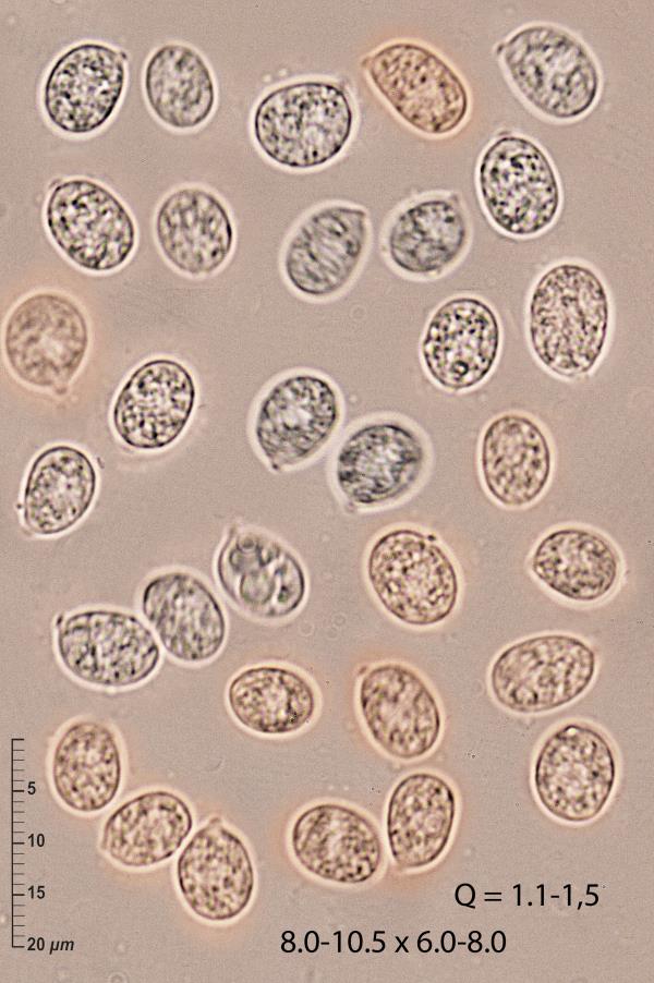 Comparando datos de las mediciones que tengo de mis recolectas, el Qm esporal que presenta Enrique es más cercano a M. inclinata que a M. galericulata. Q medio =1,6 para Mycena galericulata y 1,3-1,4 para inclinata.