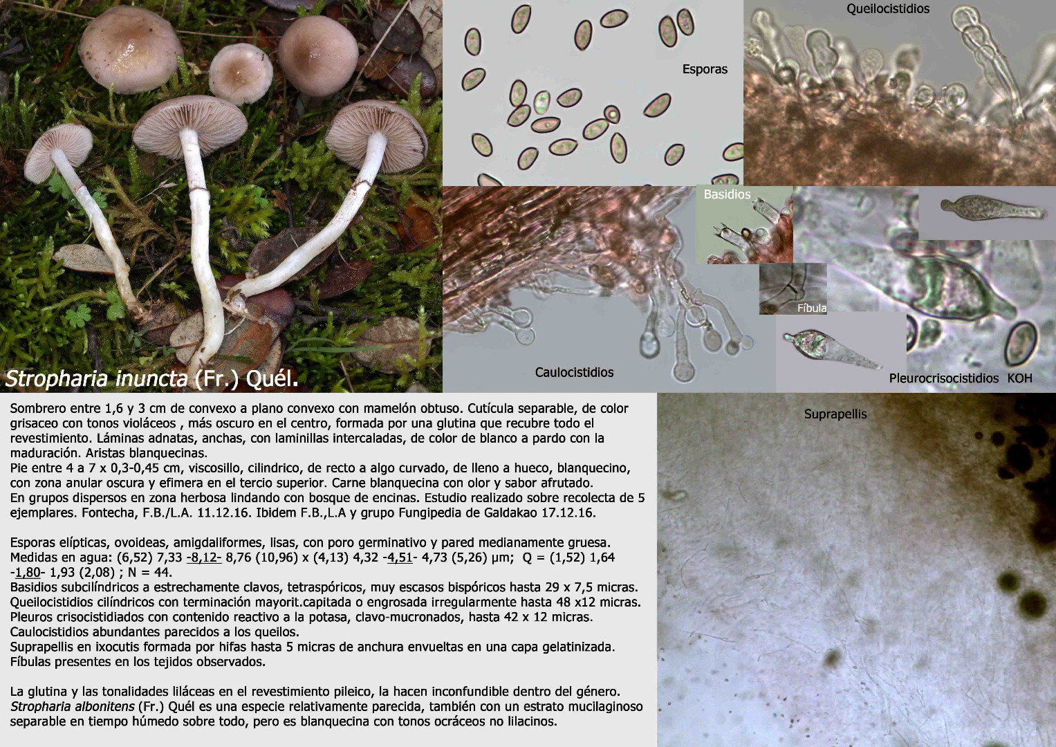 Sobre la Stropharia inuncta, darte la enhorabuena por la fantastica ficha que nos presentas. Por fin tuve la suerte de ver dicha especie en su habitat ya que dias antes el amigo Hector nos la trajo a otra salida para fotografiarlas y que Ricardo le haria la micro de rigor. Lo de Hector tiene tela, que me conste solo ha sido citada dos veces en la peninsula y el estaba en los dos sitios