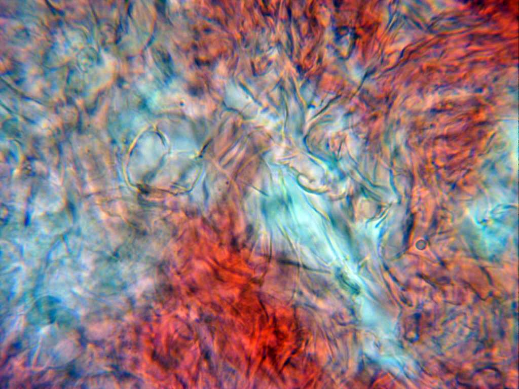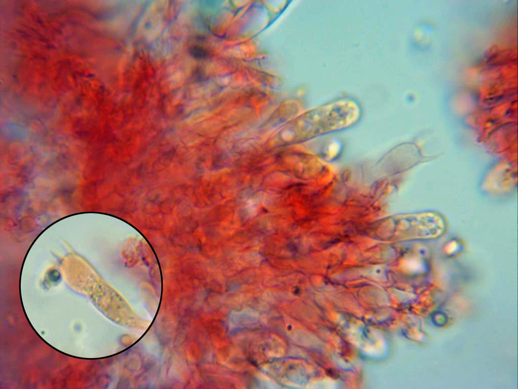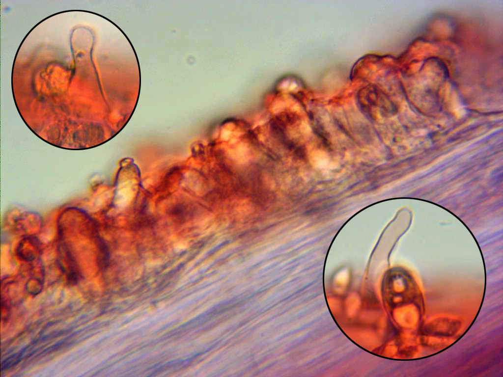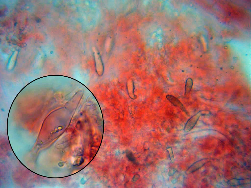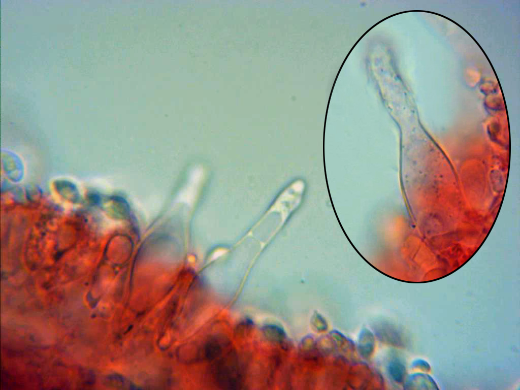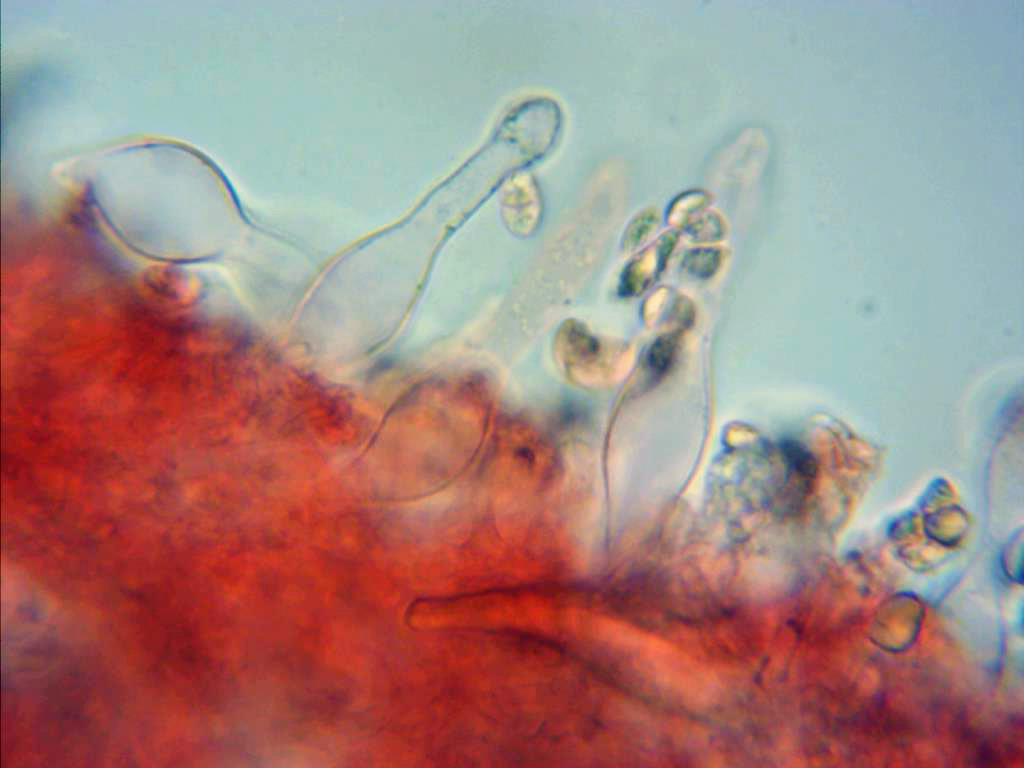 Caulocistidios presentes en la parte alta del pié, en mis mediciones, entre 23,2 y 29,3 micras de largo por 8,8;11,5 micras de ancho. Pude observar fíbulas en las hifas de la estipitipellis.