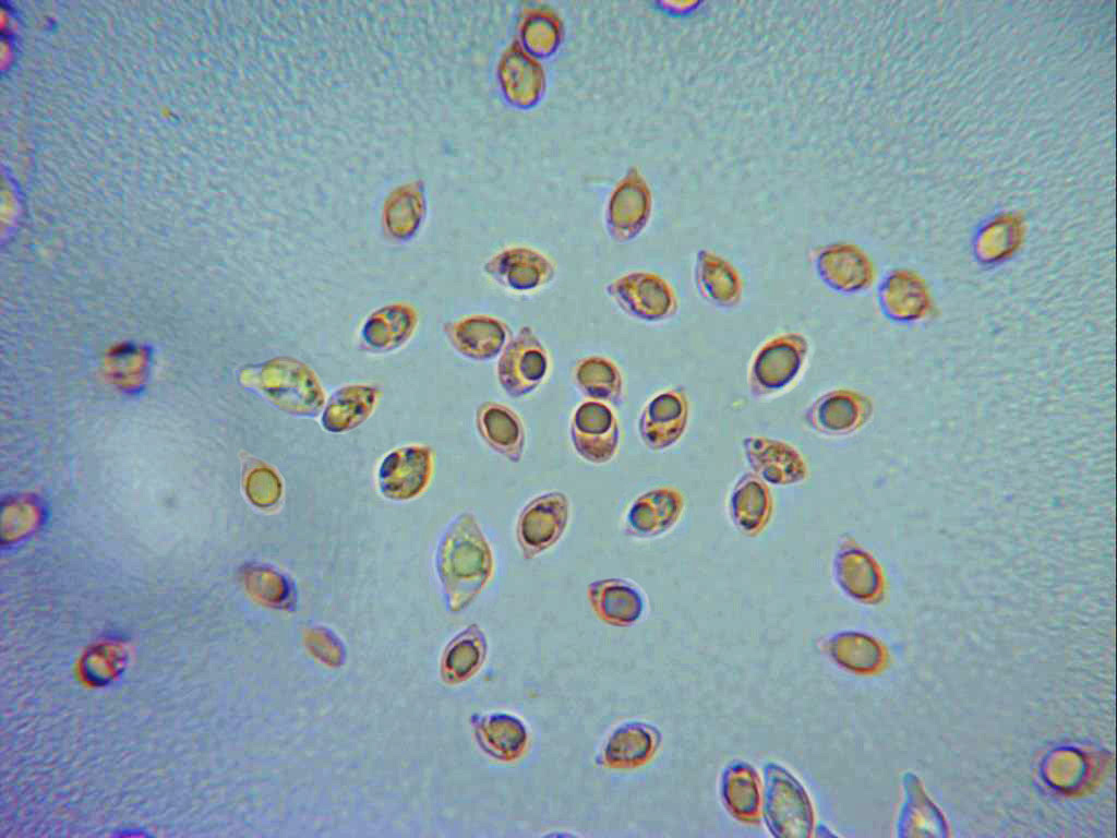 Esporas en solución de rojo congo muy diluido en agua destilada, en mis mediciones de 6,9 (7,2;8,2) 9,4 X 4,1 (4,4;5,1) 5,7 micras.