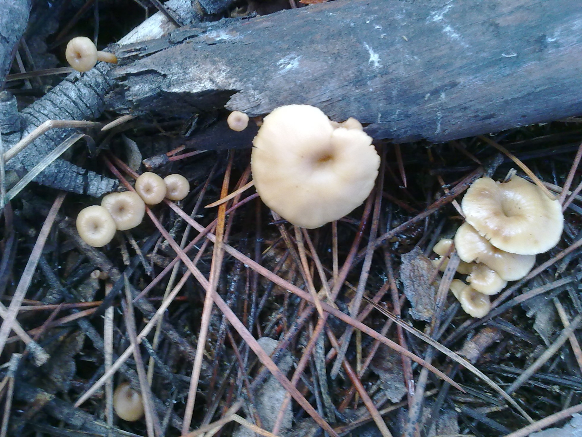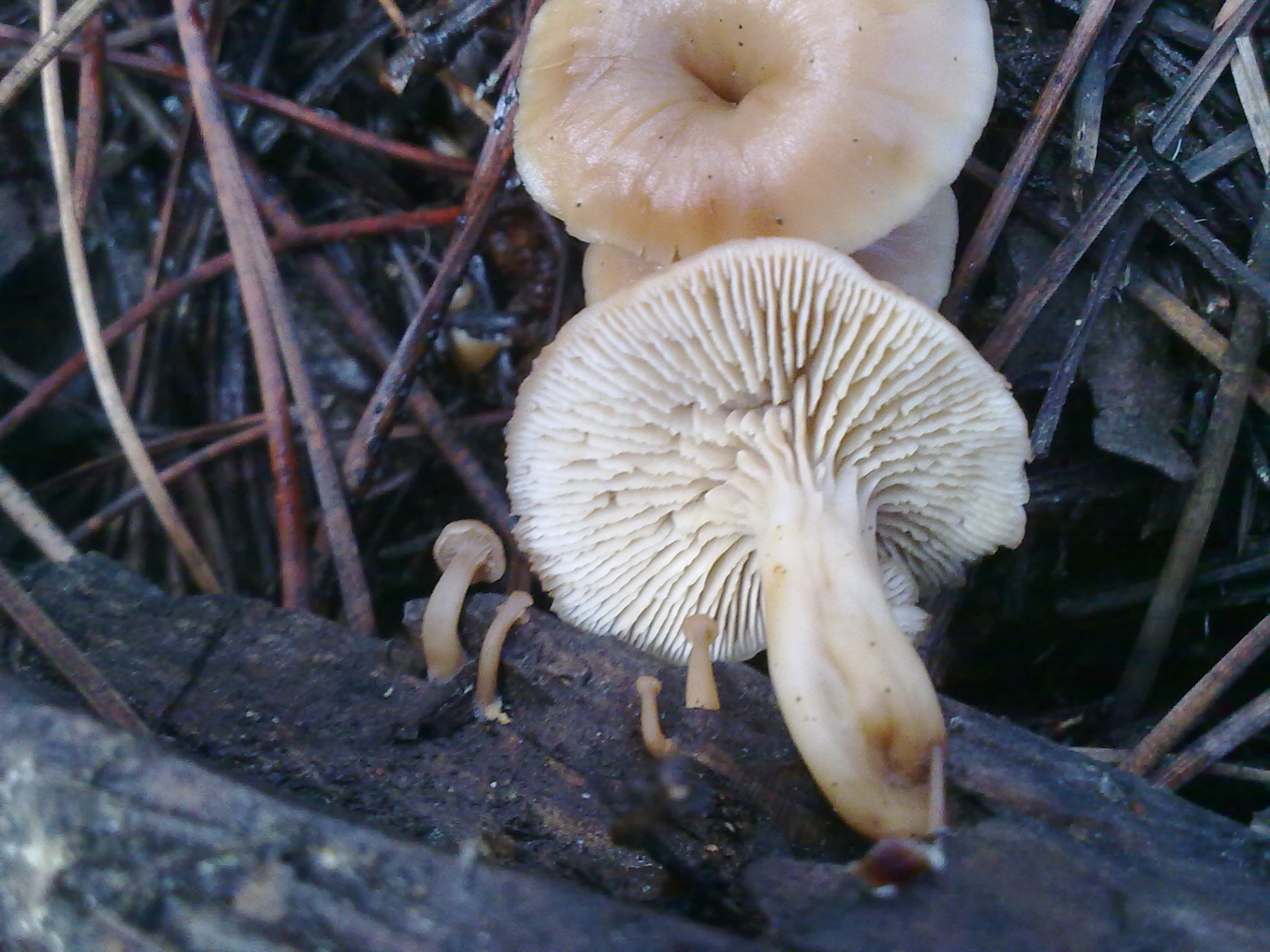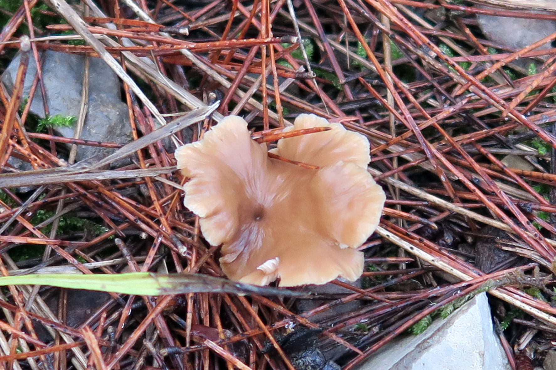 Carpóforo de pequeño tamaño, aunque parecía brotar del suelo, probablemente lo hiciera sobre algún resto leñoso, de poco más de 2 cm. de sombrero, este fuertemente embudado y borde ondulado, de color pardo claro y borde blanquecino.