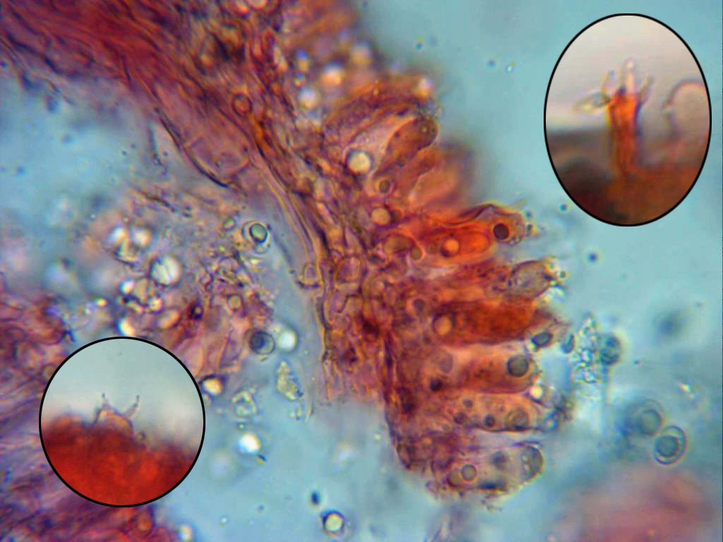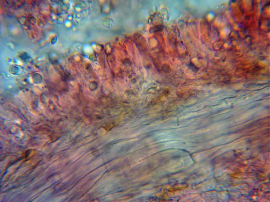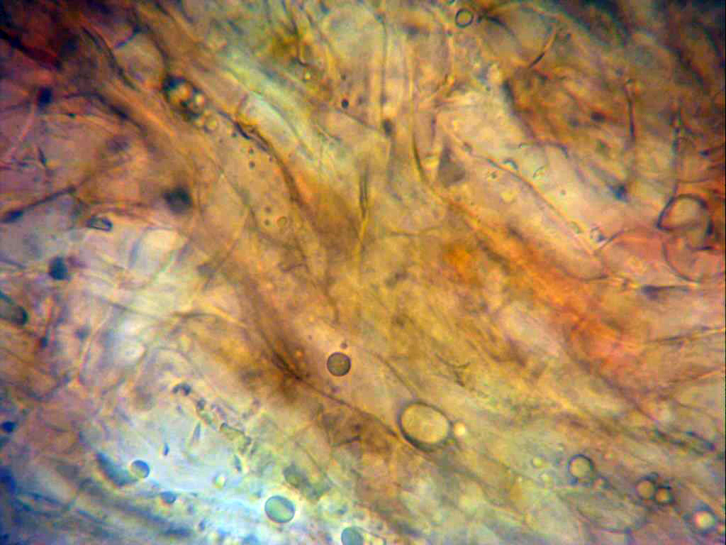Trama laminar e himenio a 1000 aumentos, se pueden observar algunas fíbulas en la trama.