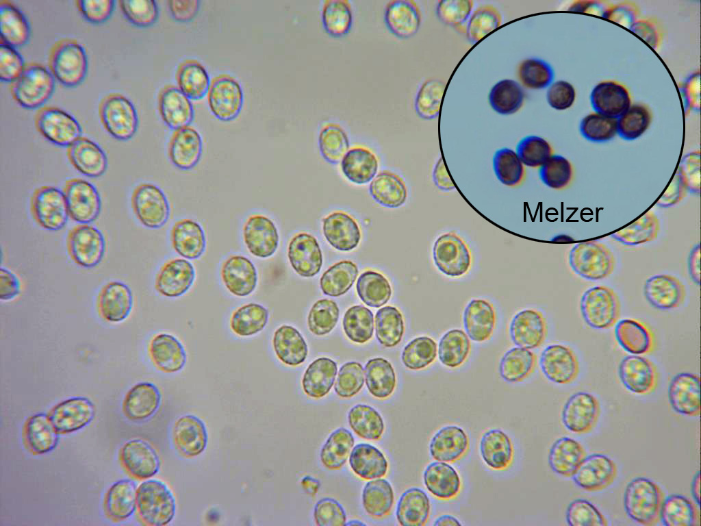 Esporas de forma entre ovoide y elipsoide, de pared ligeramente verrucosa, con una o mas vacuolas en su interior, con reacción fuertemente amiloide en reactivo de Melzer.