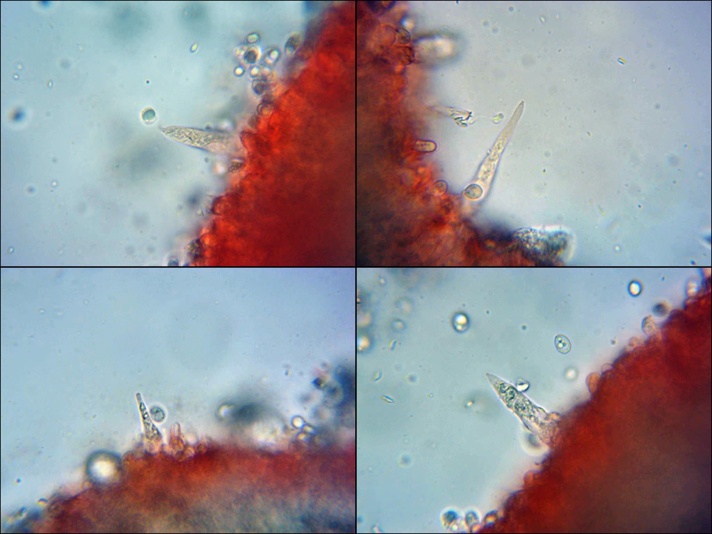 Queilocistidios de forma acicular, terminados en punta, aunque estos no eran muy abundantes en mis observaciones.