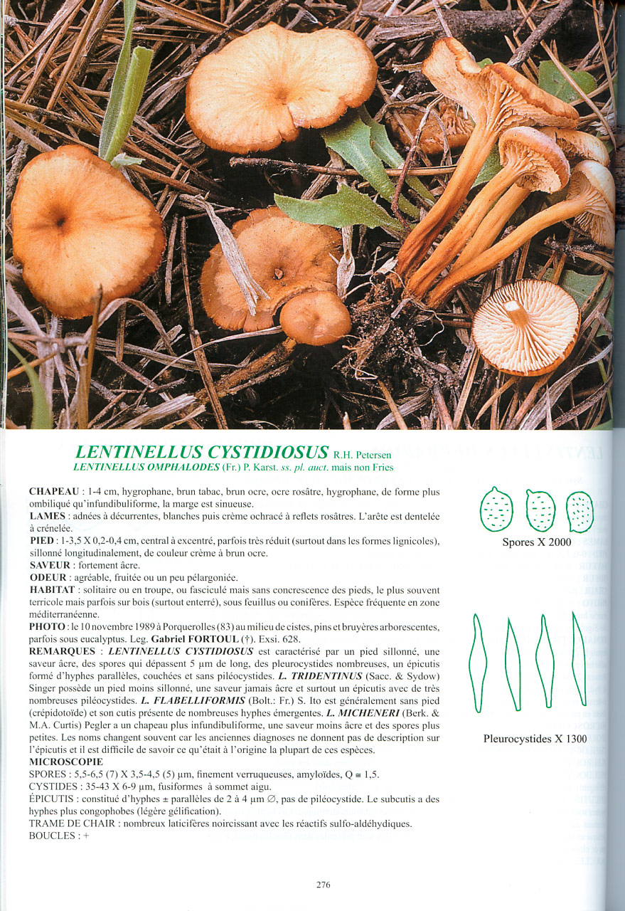 Por su tamaño, la presencia de queilocistidios y el tamaño relativamente mayor de las esporas considerando el género, así como su morfología esporal, solo se me ocurre que pueda tratarse de la especie propuesta Lentinellus cystidiosus