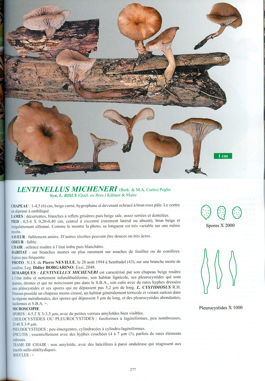 Si me he inclinado por Lentinellus flabelliformis ha sido solo por las medidas esporales que en mi caso (acabo de observar que se me olvidó el indicarlas) es de 5,6;6,8 X 4,3;5,1 micras, considerando la mayoría de ellas con una anchura superior a las 4,5 micras. Para el Lentinellus micheneri las medidas esporales deberían ser de 4,5;6,5 X 3,5;4,5.