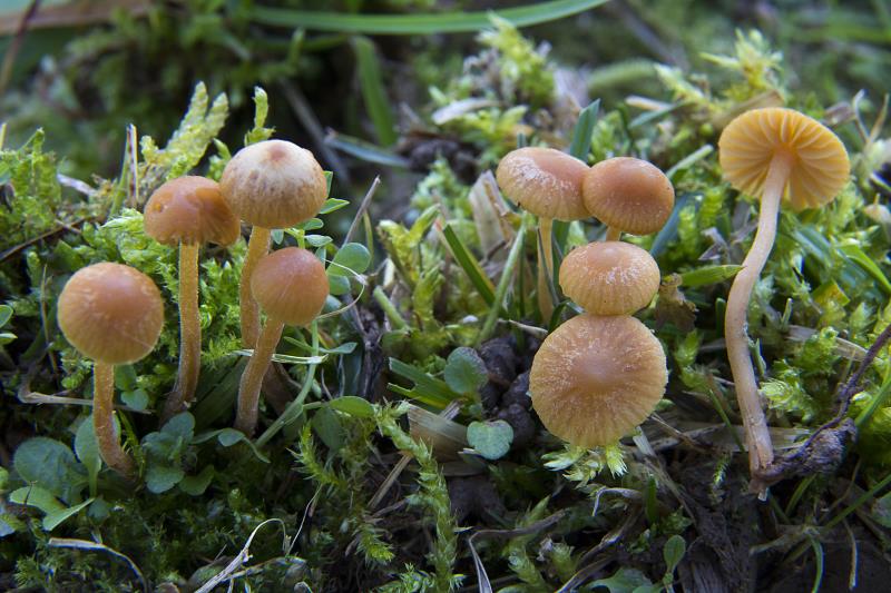 Ejemplares recolectados en Arnao (Castrillón), brotando entre plantas herbáceas y musgos. Sombreros de hasta 2 cm de diámetro, de color ocre ambarino a amarillento, higrófano, estriado, de hemisférico a convexo, ligeramente pruinoso. Láminas adnatas a sublibres, ventrudas, con laminillas intercaladas, de color ocre amarillento, adoptando un tono herrumbroso en la madurez. Pie cilíndrico, alargado, frecuentemente recurvado, de color más pálido que el sombrero, en ocasiones recubierto de una pruina blanquecina. Olor inapreciable.