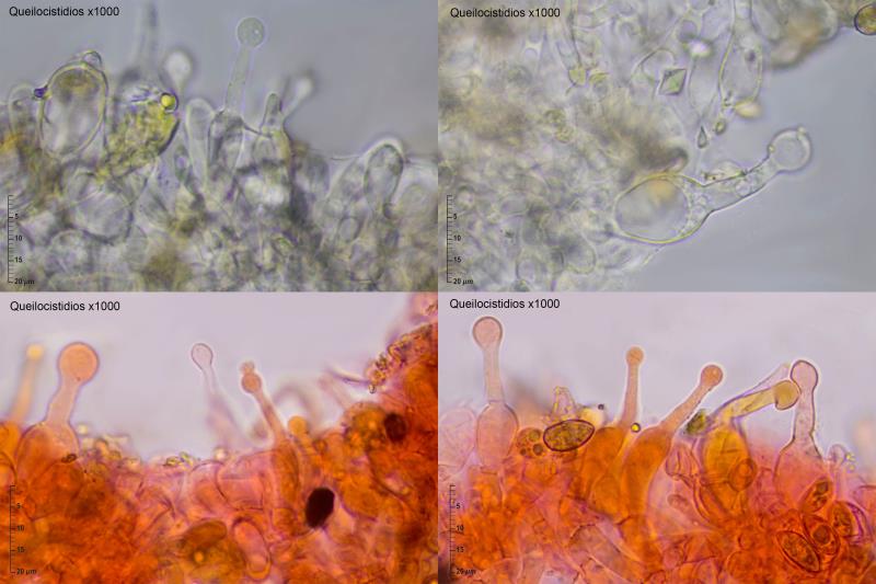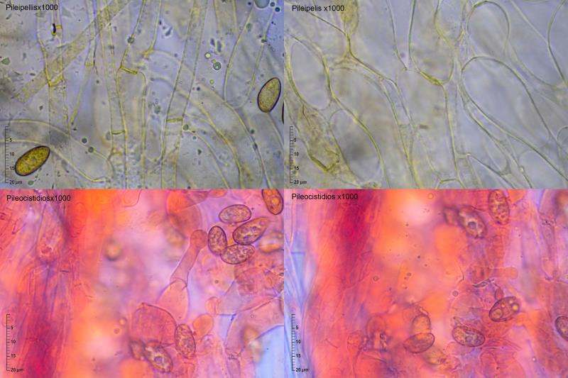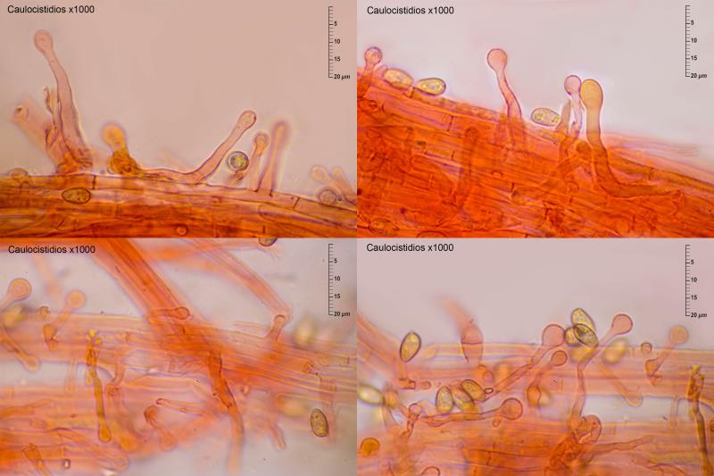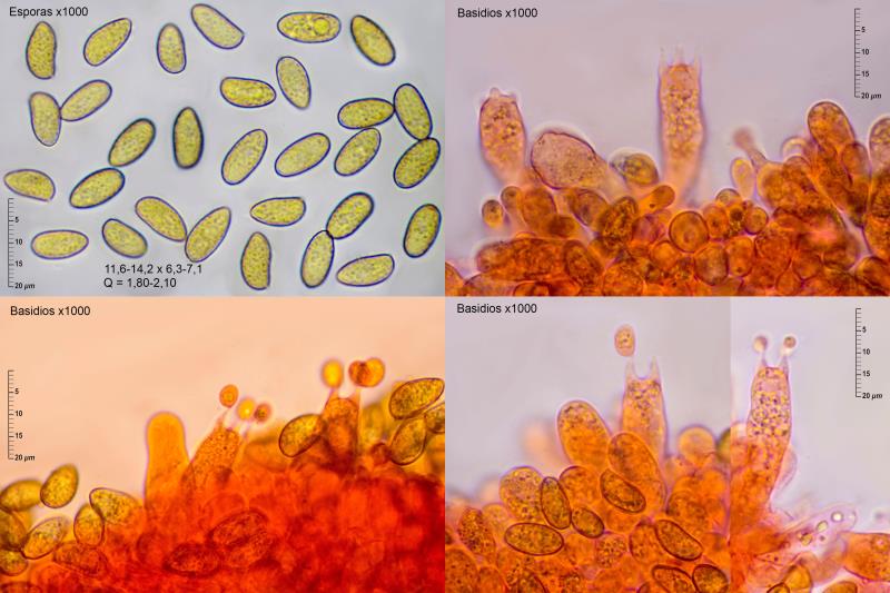 Esporas amigdaliformes, elipsoidales, suavemente verrucosas: (11,3)11,6-13,6-14,2(14,6) x (6,1)6,3-6,9-7,1(7,4); Q = (1,68 )1,80-2,10(2,23). Basidios generalmente tetraspóricos, con presencia de algún basidio bispórico. Queilocistidios y caulocistidios abundantes, mayoritariamente tibiiformes. Pileipellis con presencia puntual de caulocicistidios, por lo general tibiiformes. No se aprecian fíbulas en ninguno de los tejidos.