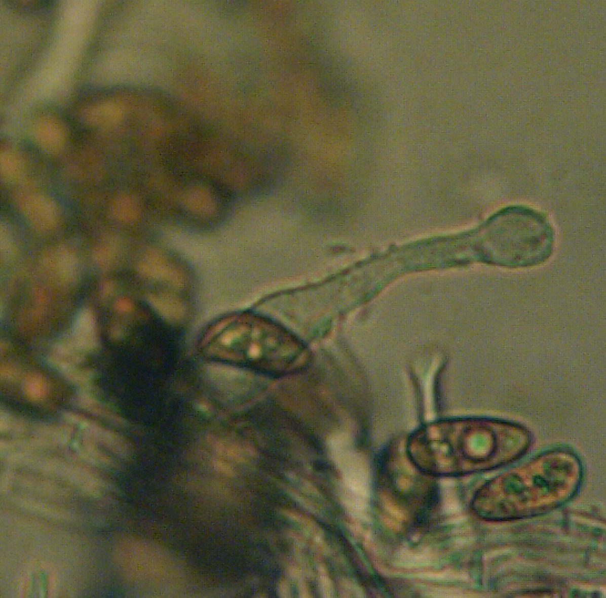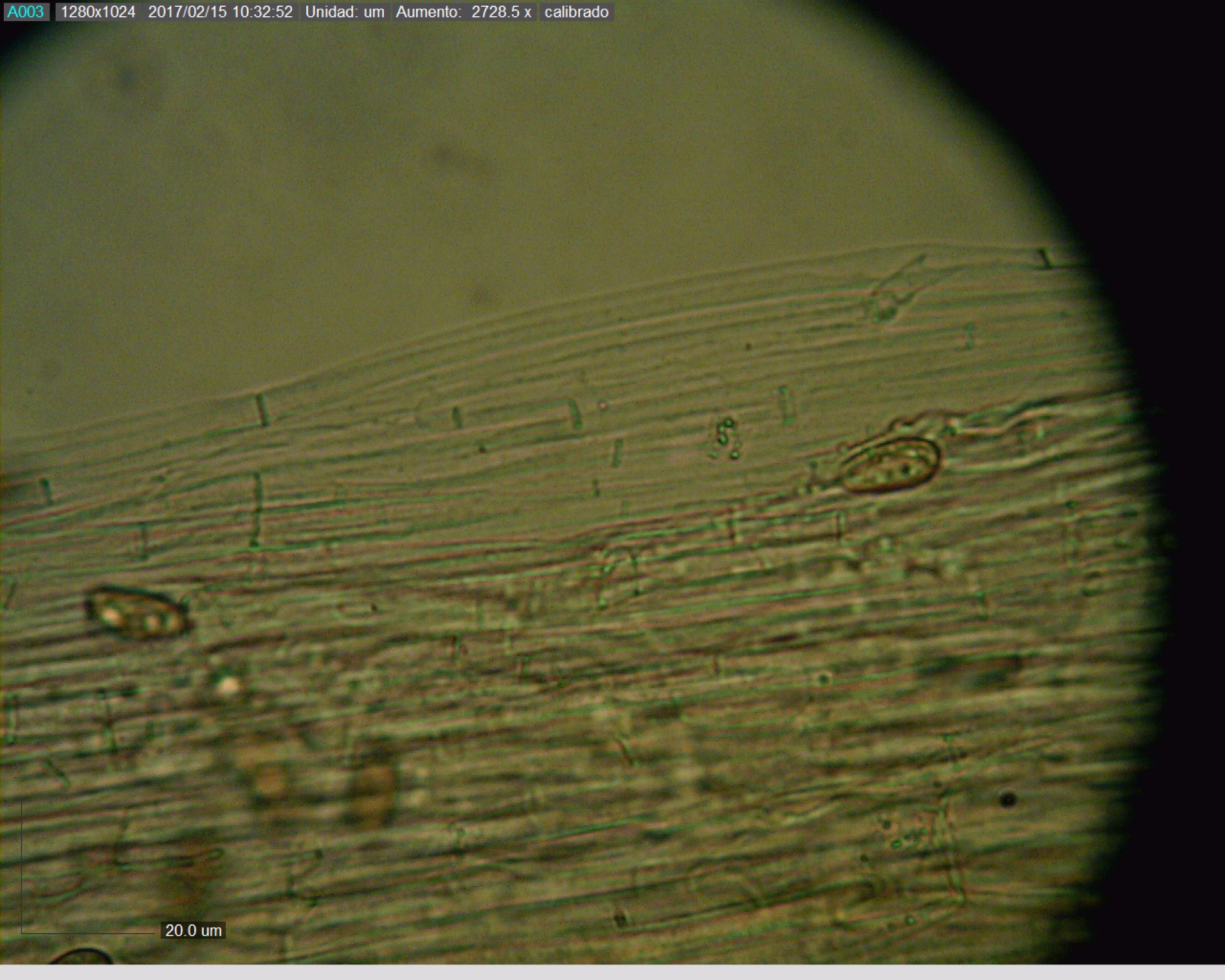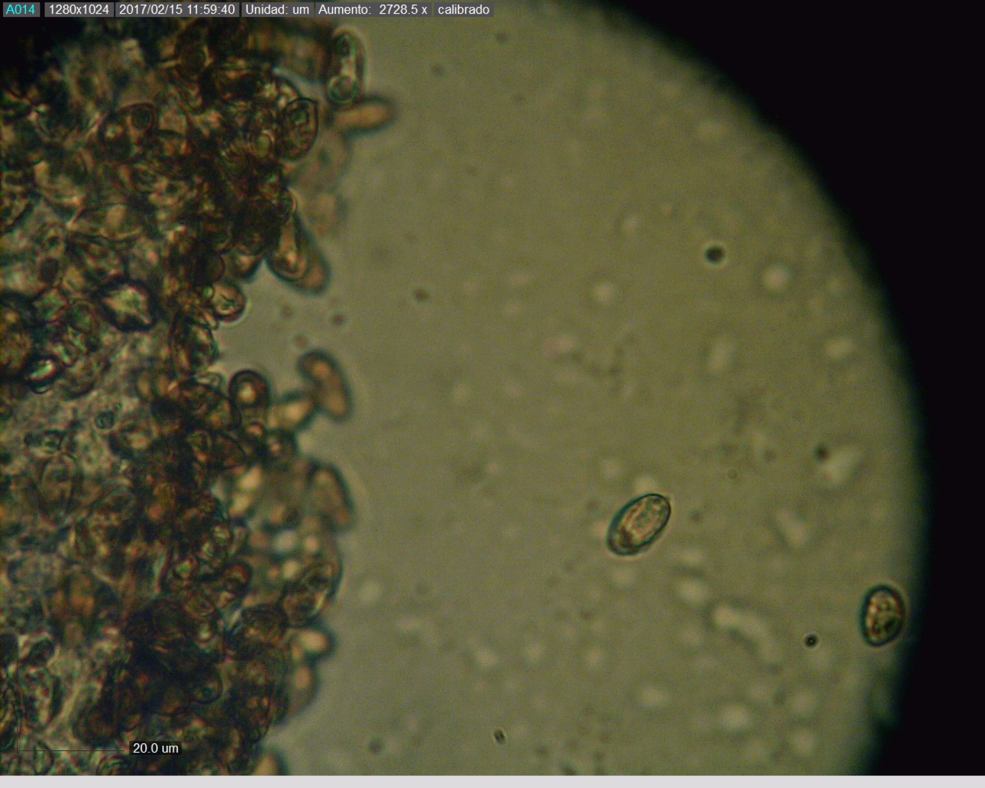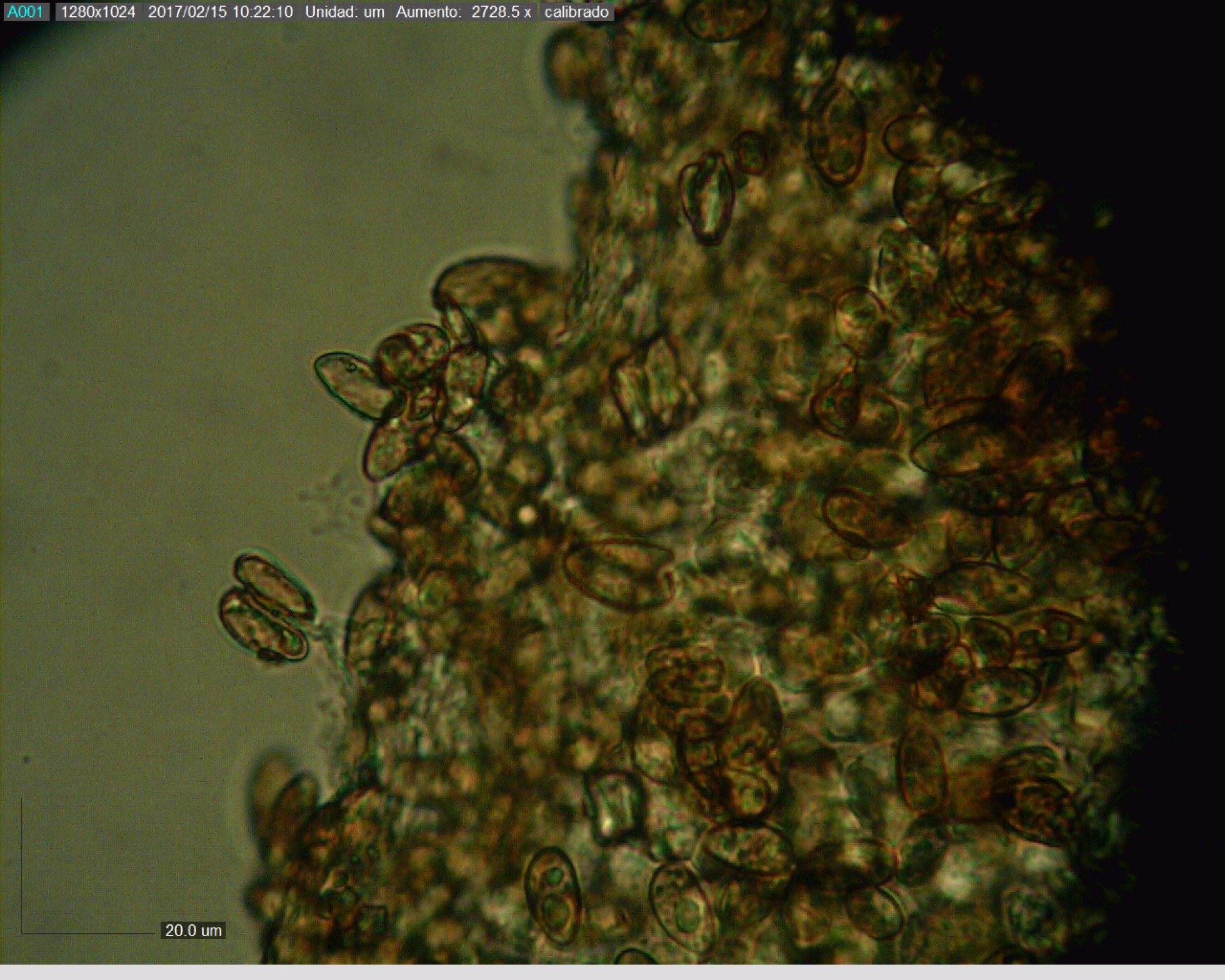 Esporas grandes, 8micras y en una que esta sola se puede apreciar que tiene ornamentación en la pared, como verrugas.