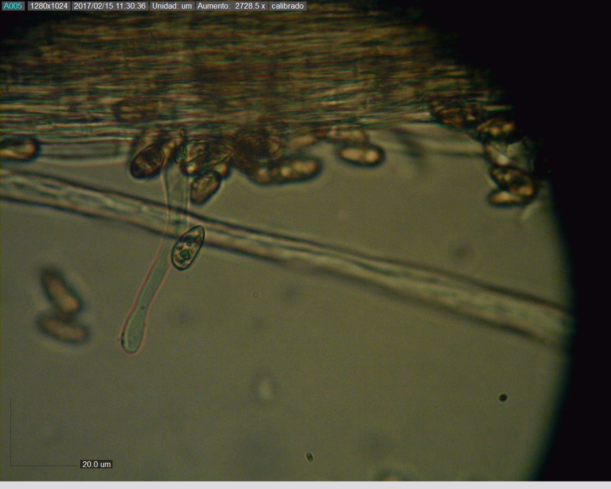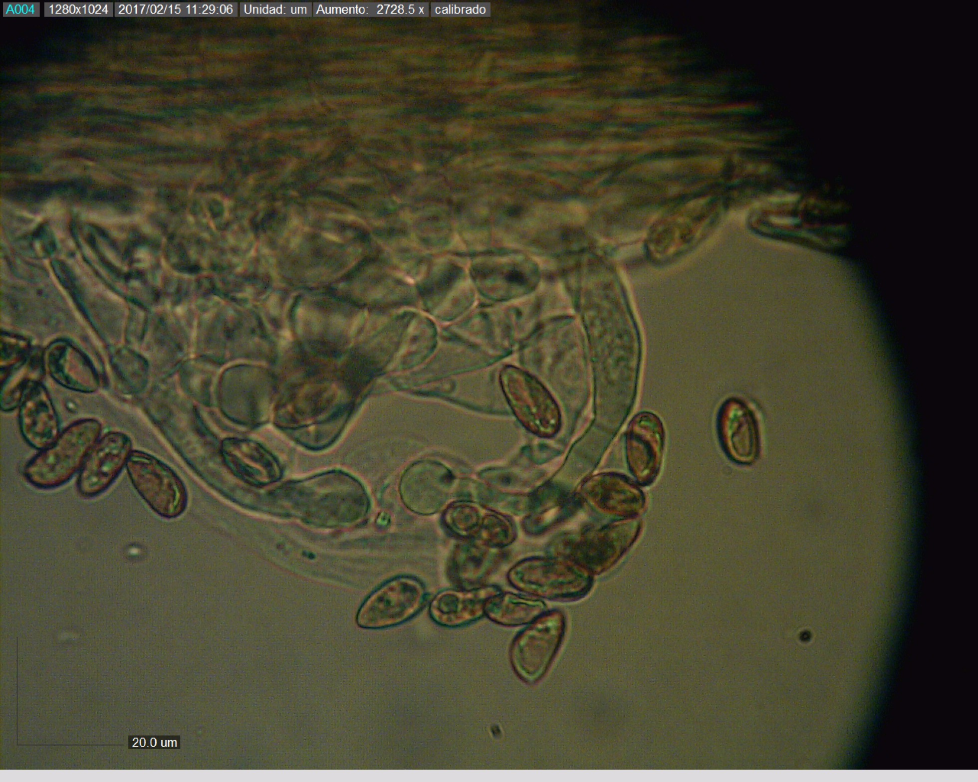 Perdonad chicos que interrumpa, creo que en cuanto a las medidas esporales que debería presentar hay bastante disparidad de opiniones, aunque sea raro que no hubierais encontrado queilocistidios, la forma de los caulocistidios si encajaría, así como las medidas esporales mostradas, encaja bien con la descripción que hacen de ella en el siguiente enlace.