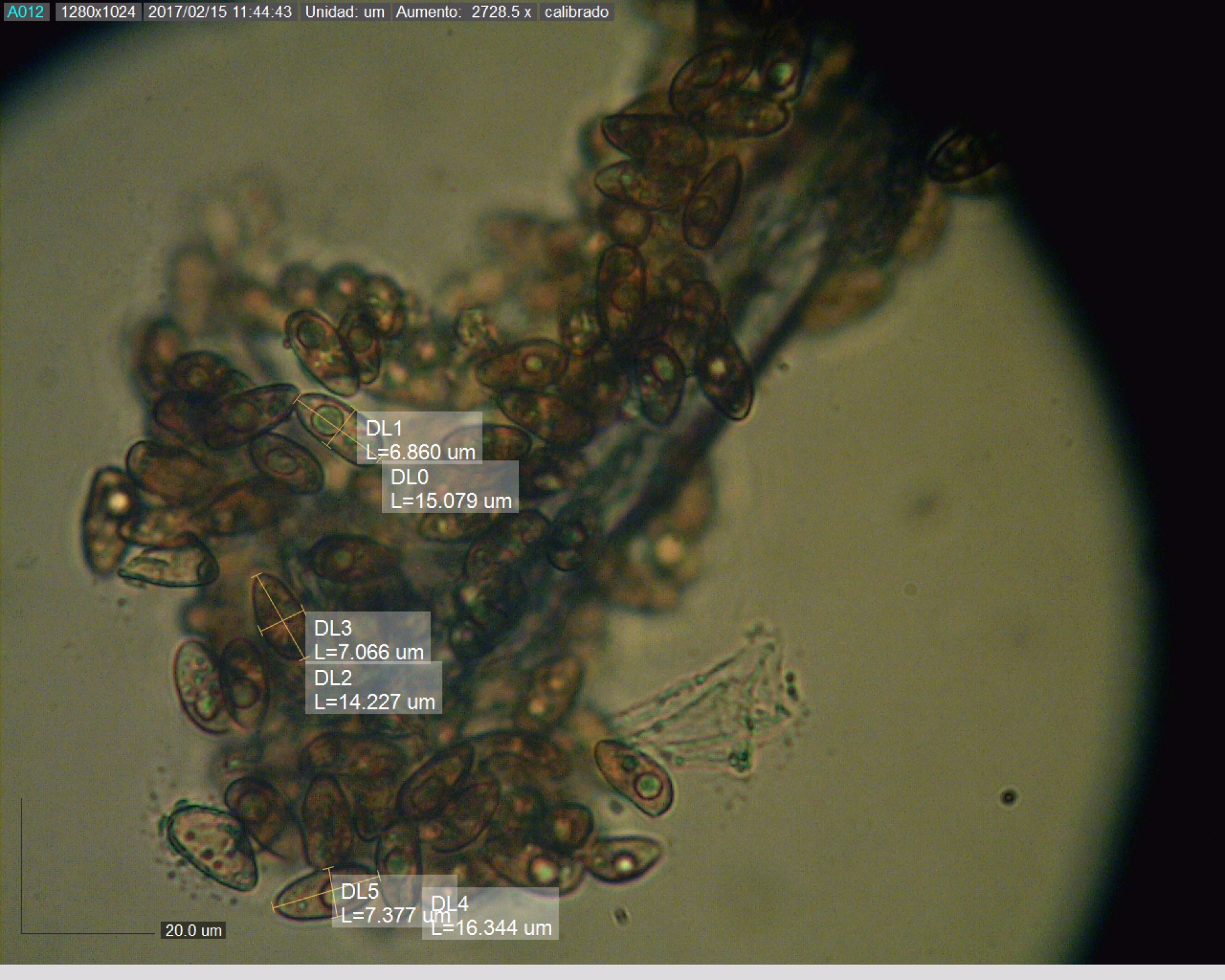 Se indica una medida esporal para Galerina clavata de 11 (12;16) 17 X (6;8) 8,5, además de encajar la morfología esporal.