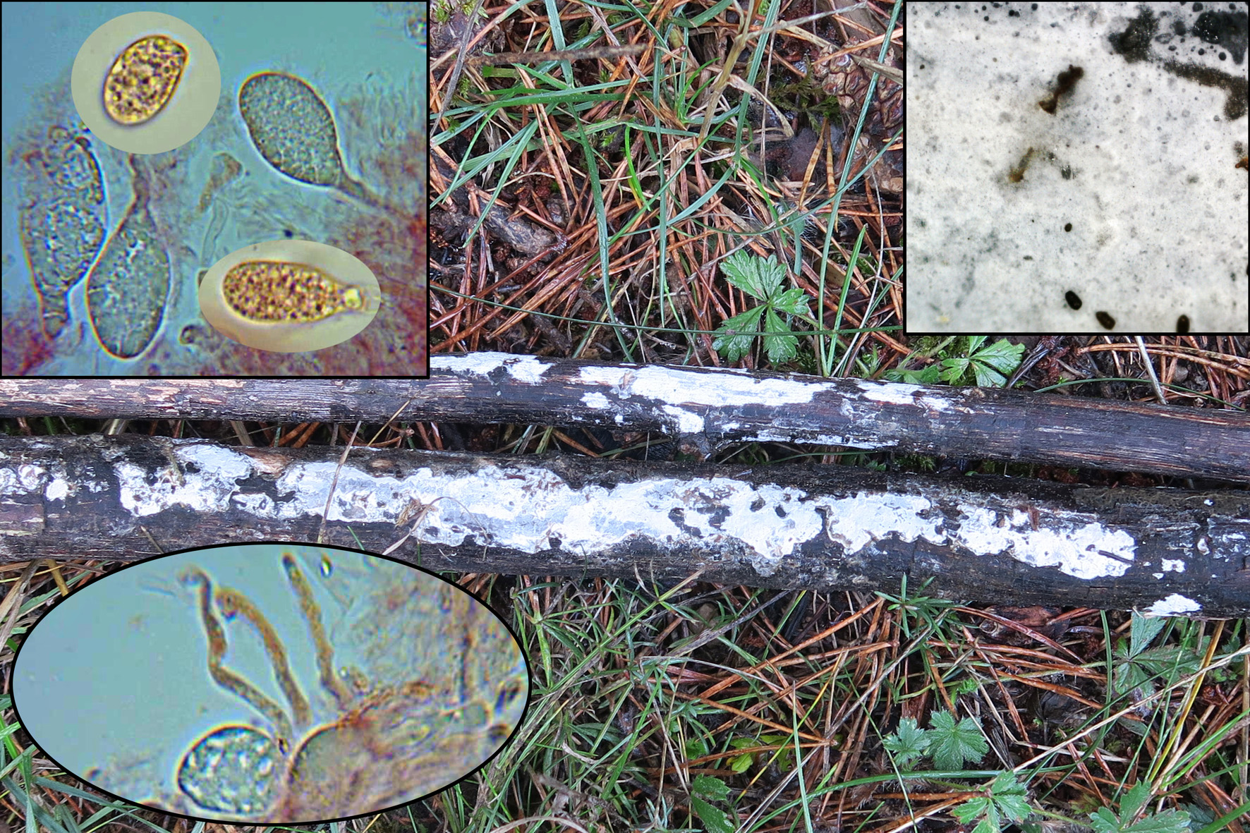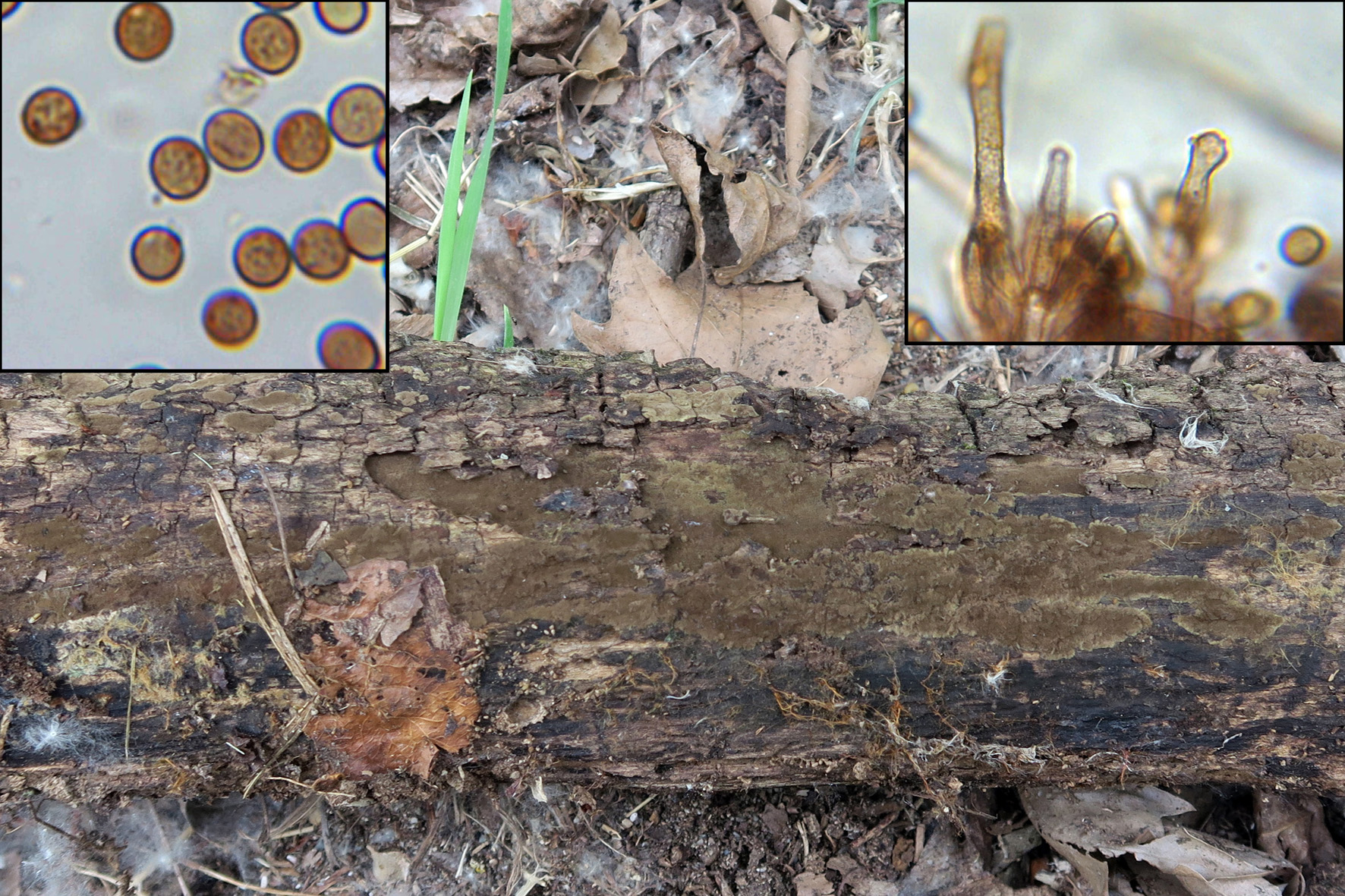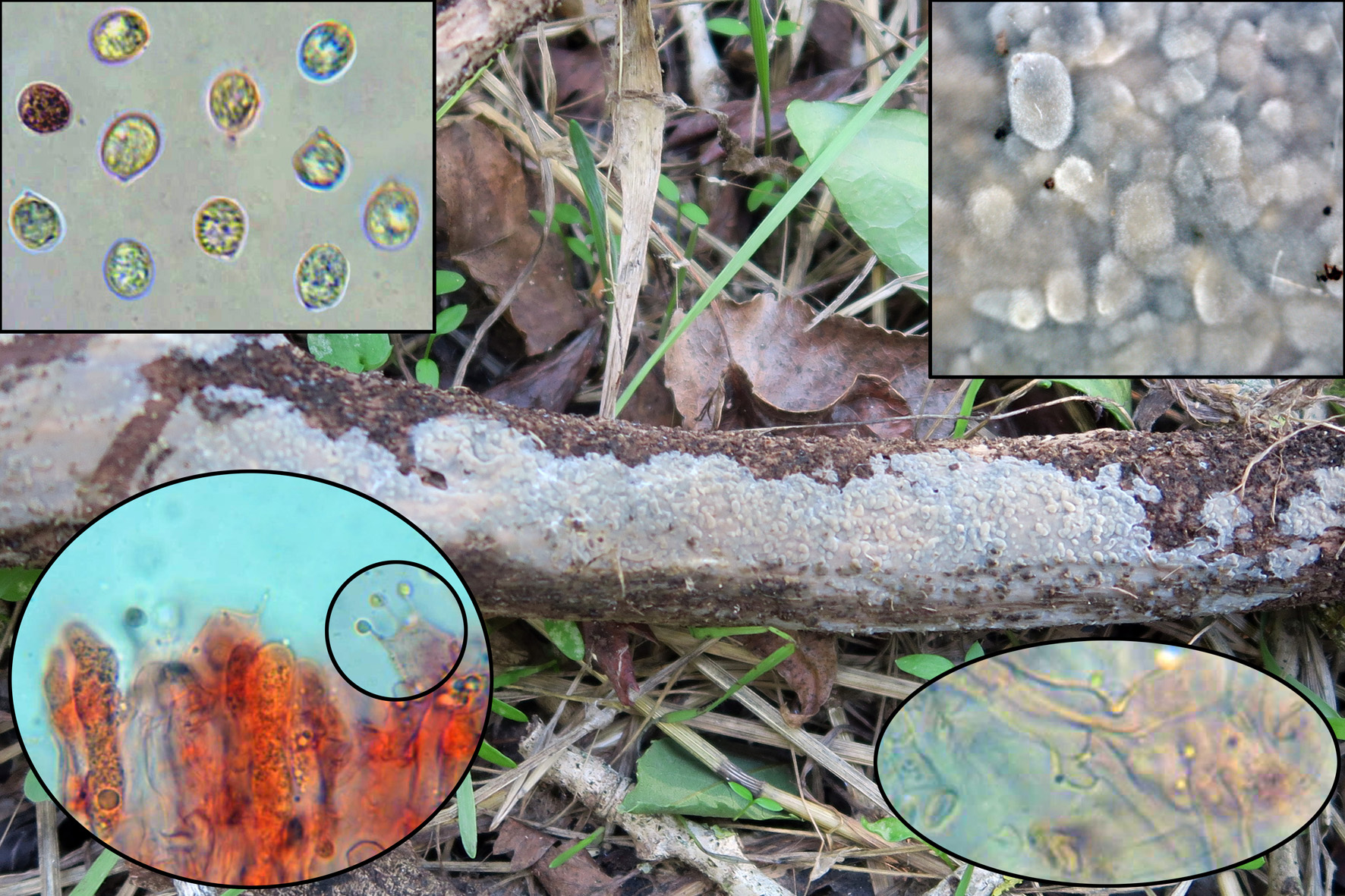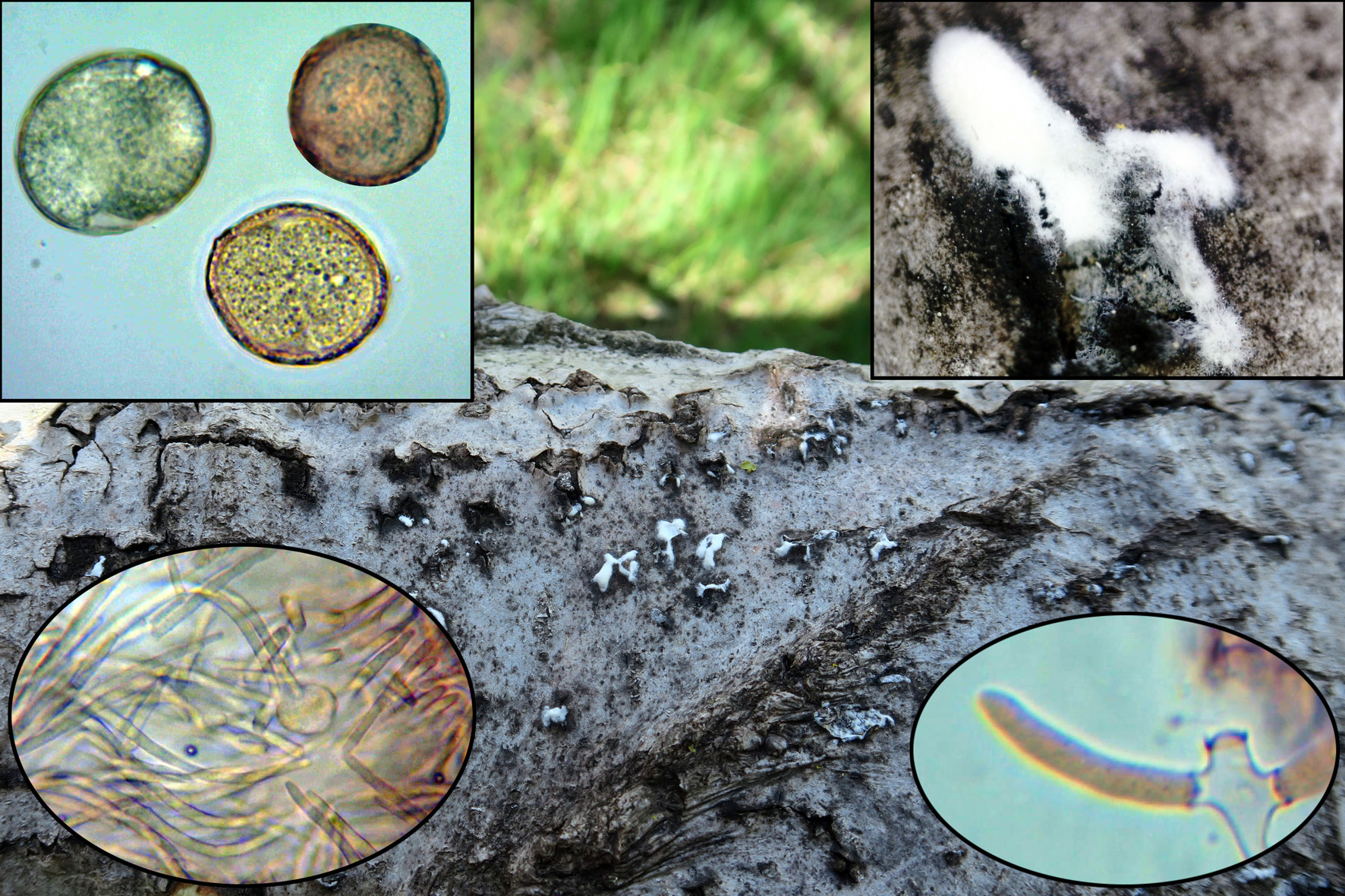 Una de diminuta sobre un tronco de árbol de ribera, con grandes esporas. Con hifas sin septos, en la miniatura de la derecha un zoosporangio, las esporas de doble pared, parece bastante claro que se trata de un Oomiceto, por sus características dentro de estos probablemente Phytophthora, de Phytophthora que puedan afectar a árboles de ribera hay por lo menos seis, precisándose hasta de estudios de su ADN `para diferenciarlas, esta es de las que se quedan irremediablemente como Phytophthora sp.