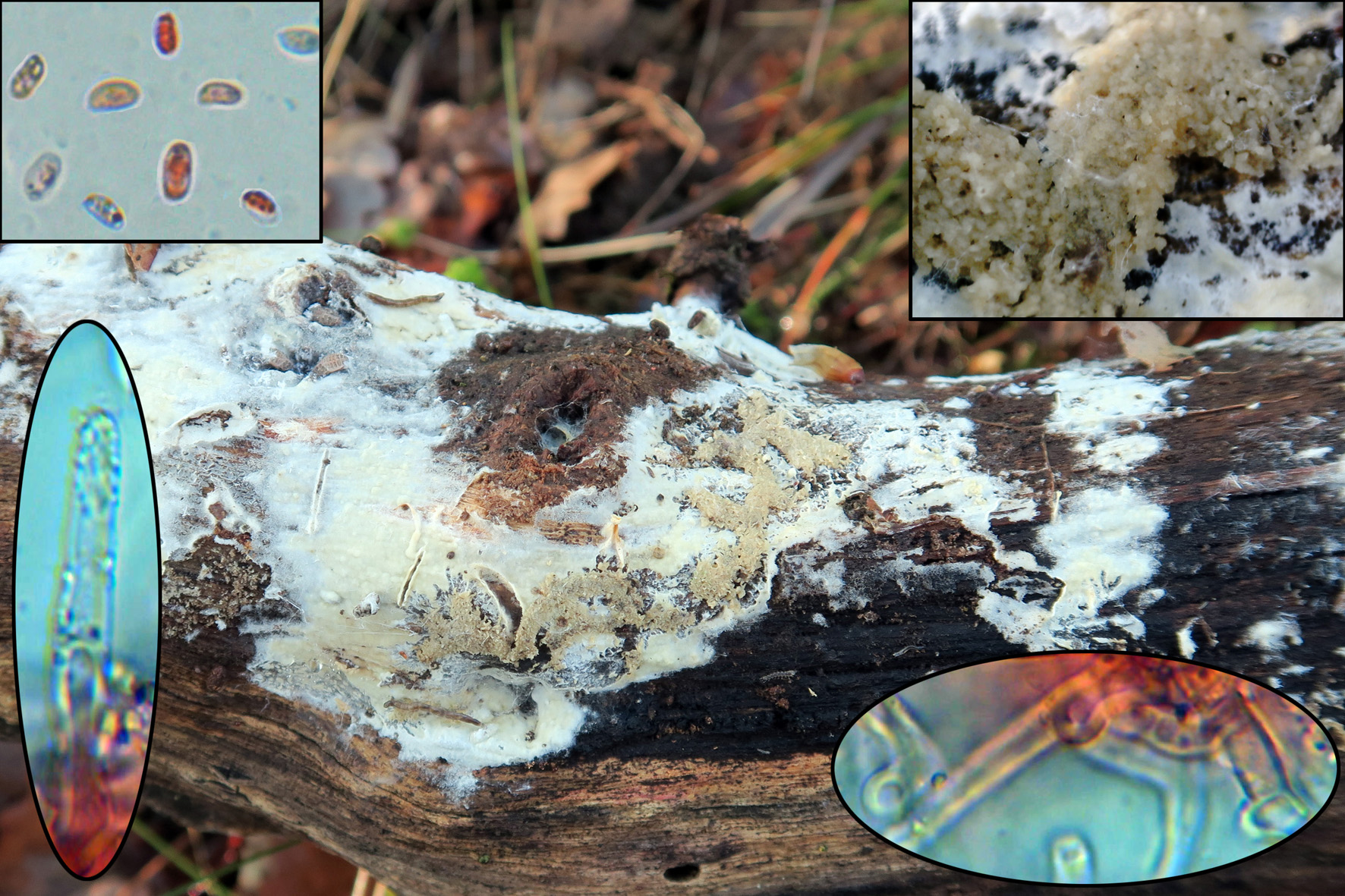 Una roña de aspecto céreo, con basidios tetraspóticos e hifas fibuladas, Radulomyces confluens.