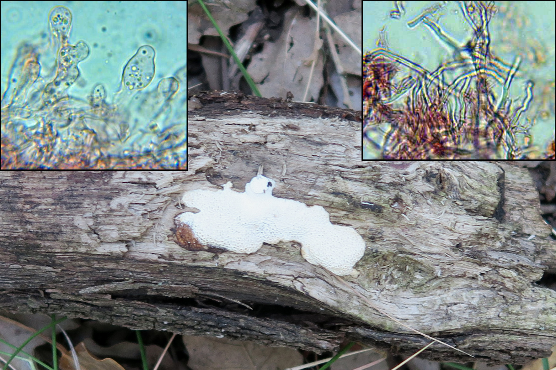 Este por la parte de encima de un tronco, a pesar de que no pude observar esporas por tratarse de un ejemplar joven, por el borde negruzco que ya empieza a mostrarse en la imagen y su sistema de hifas dimítico, tiene que tratarse de Dichomitus campestris