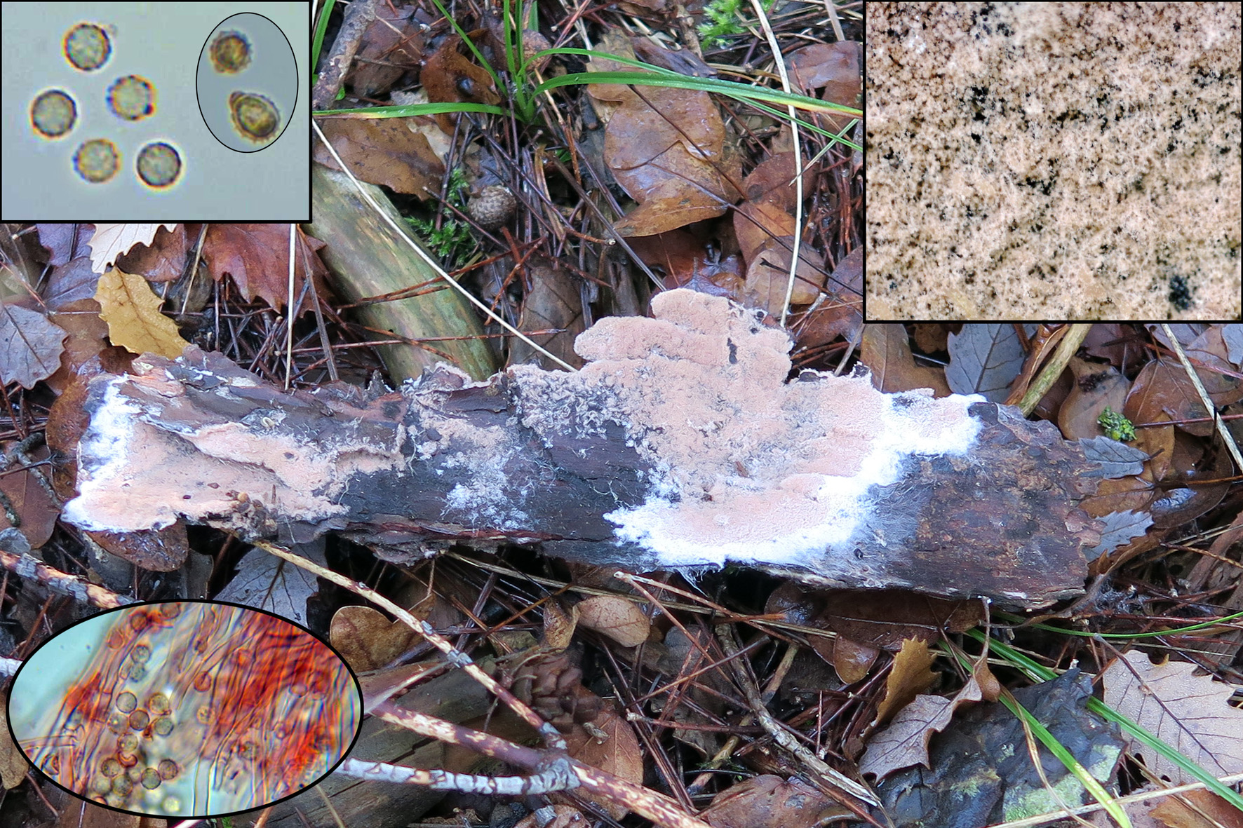 Una de parecida a la Tomentella, hasta con tonos rosados, cubriendo los restos vegetales del suelo, con esporas con púas, Tomentellopsis echinospora