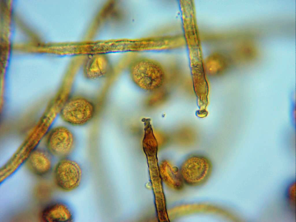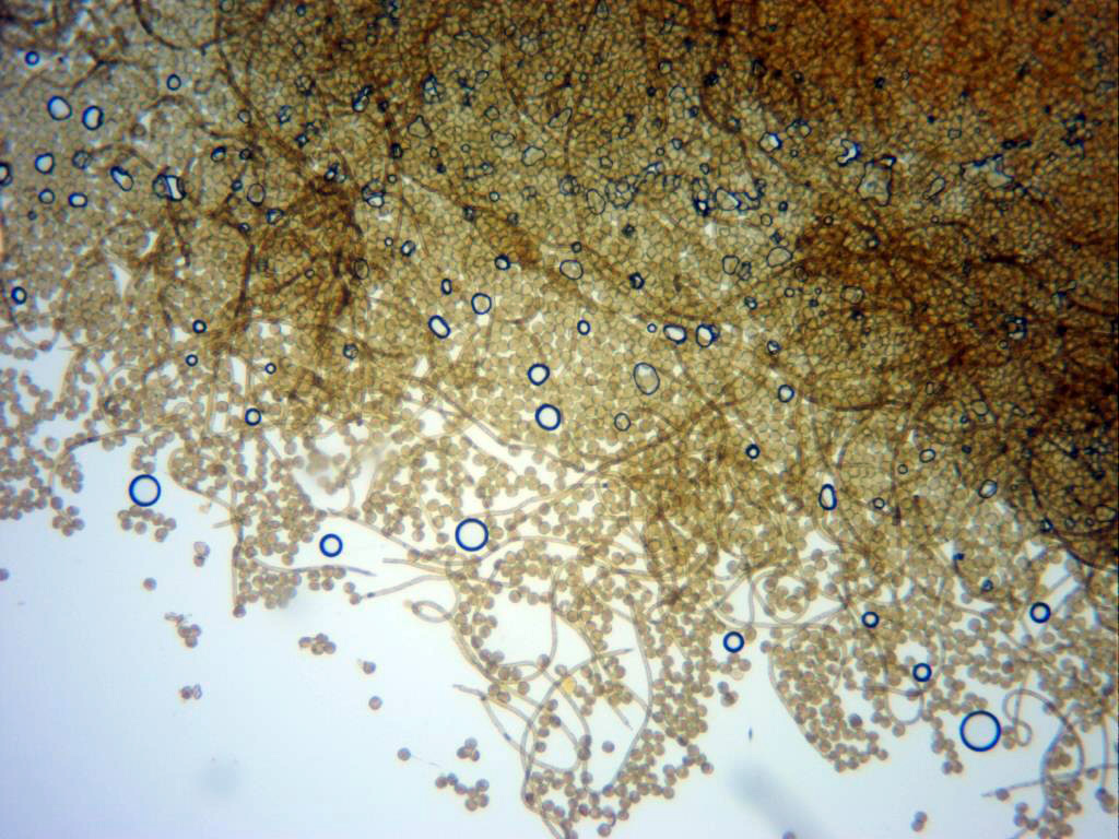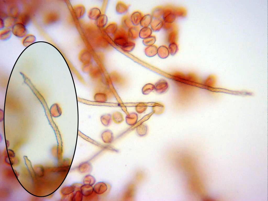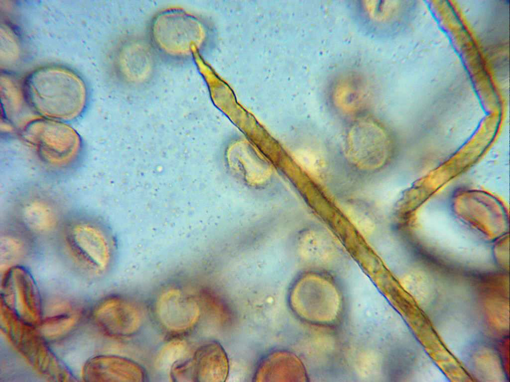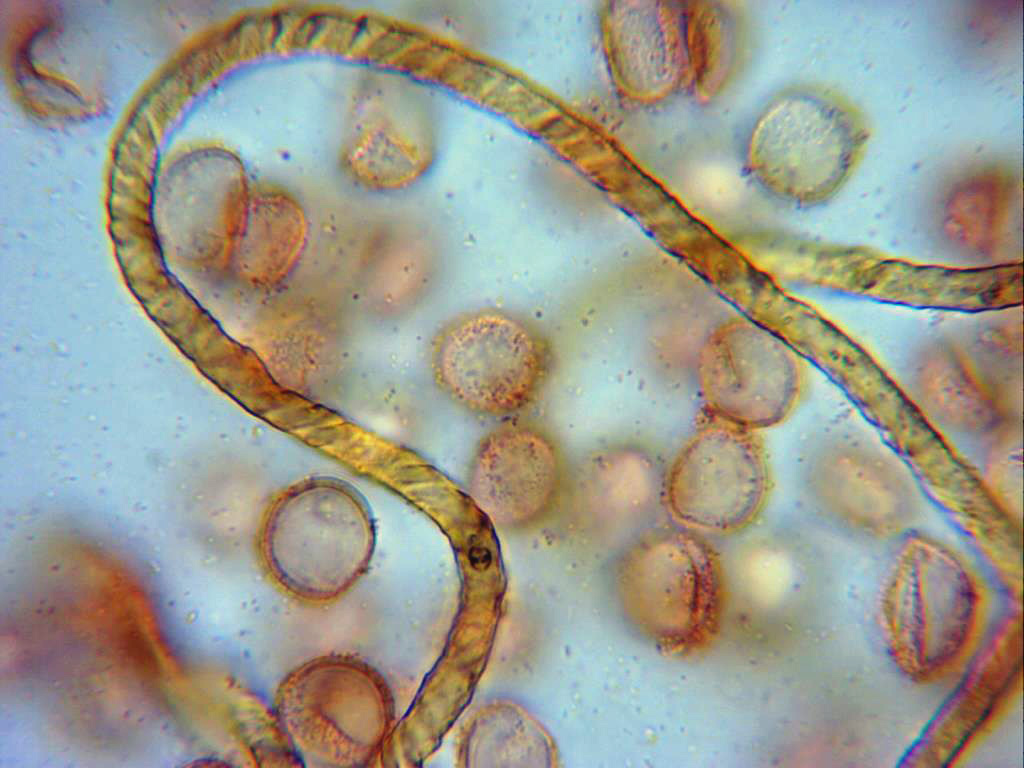 Túbulos (eláteres o elaterios, según autor), en mis mediciones de 3,3 a 5,2 micras de ancho, acordes con la bibliografía de la especie que indica un tamaño de 3 a 5 micras.