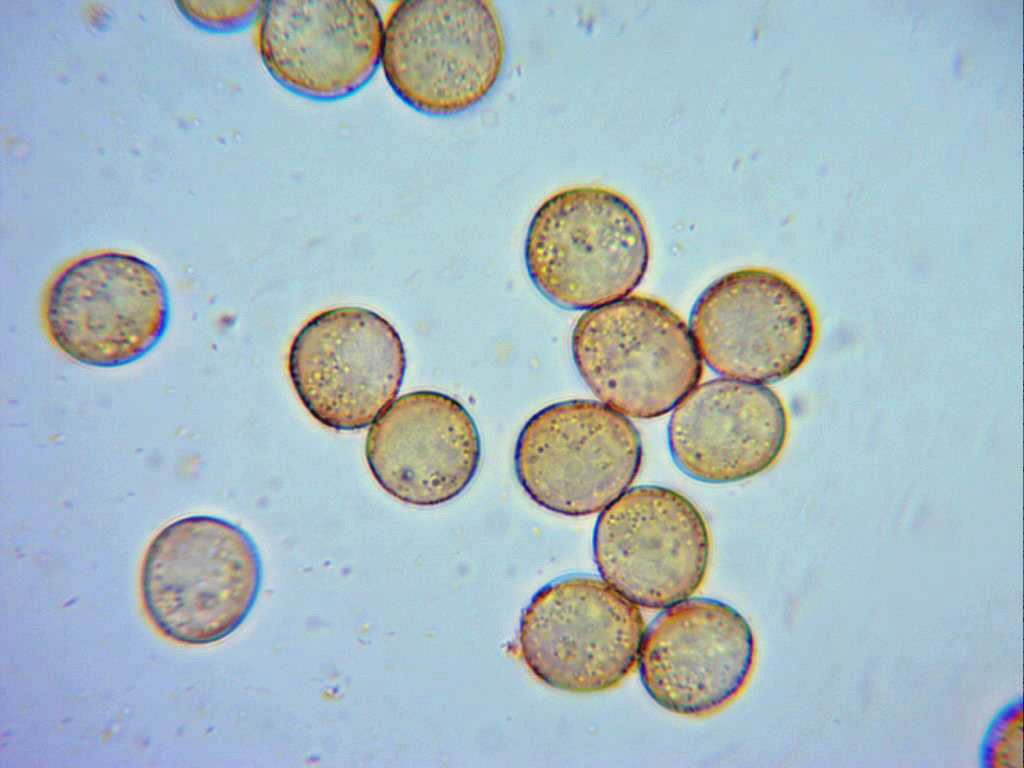 Esporas globosas o ligeramente subglobosas, de un color amarillo a amarillo verdoso, densamente pobladas de diminutas verrucosidades en su interior, en mis mediciones de entre 11,2 a 14,2 micras, este dato también concuerda con la bibliografía consultada, Hideenforest (11;16), DiscoverLife (12;14), Micobotanicajaen (11,52;14,23) y Granada Natural (11,5;13,5).