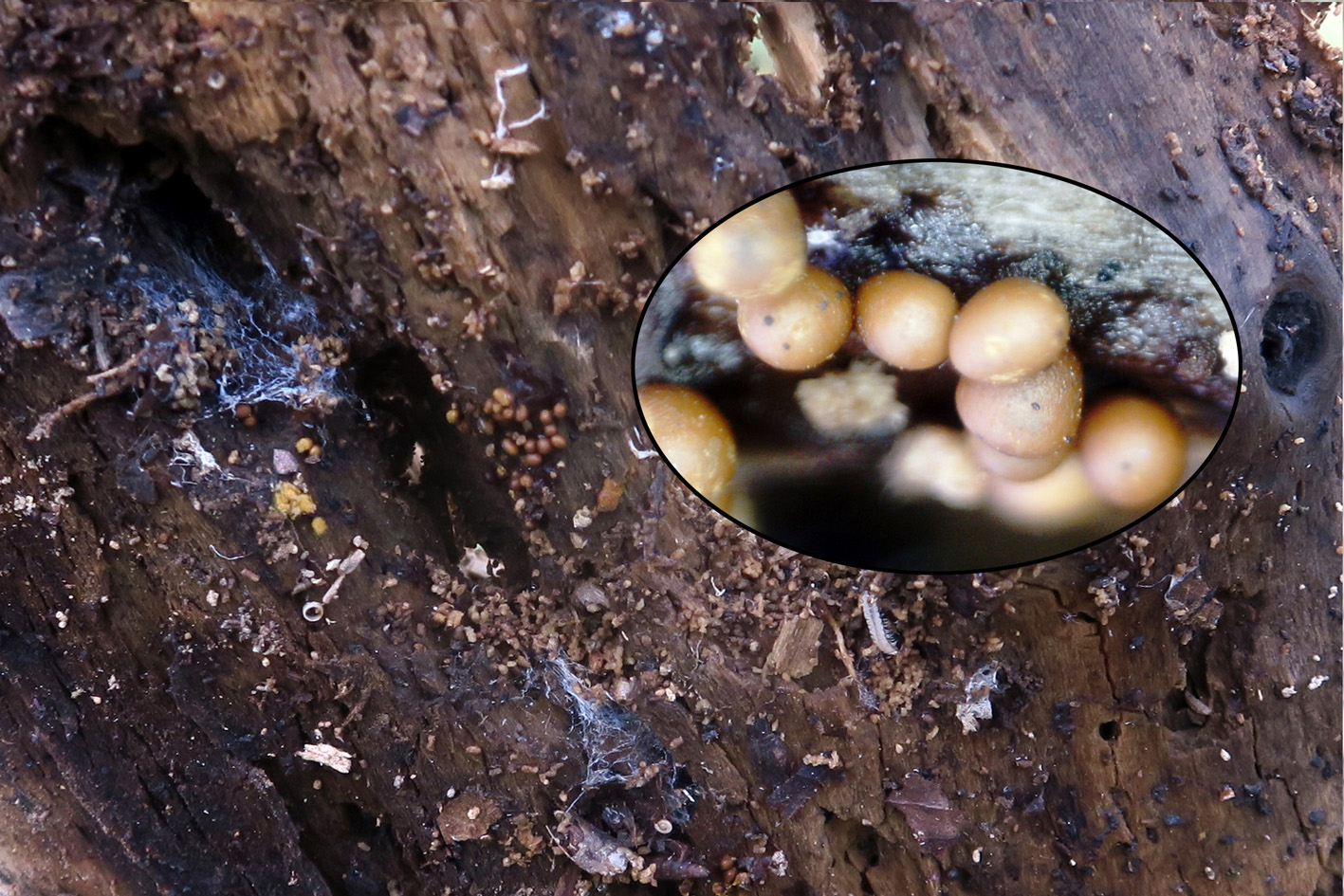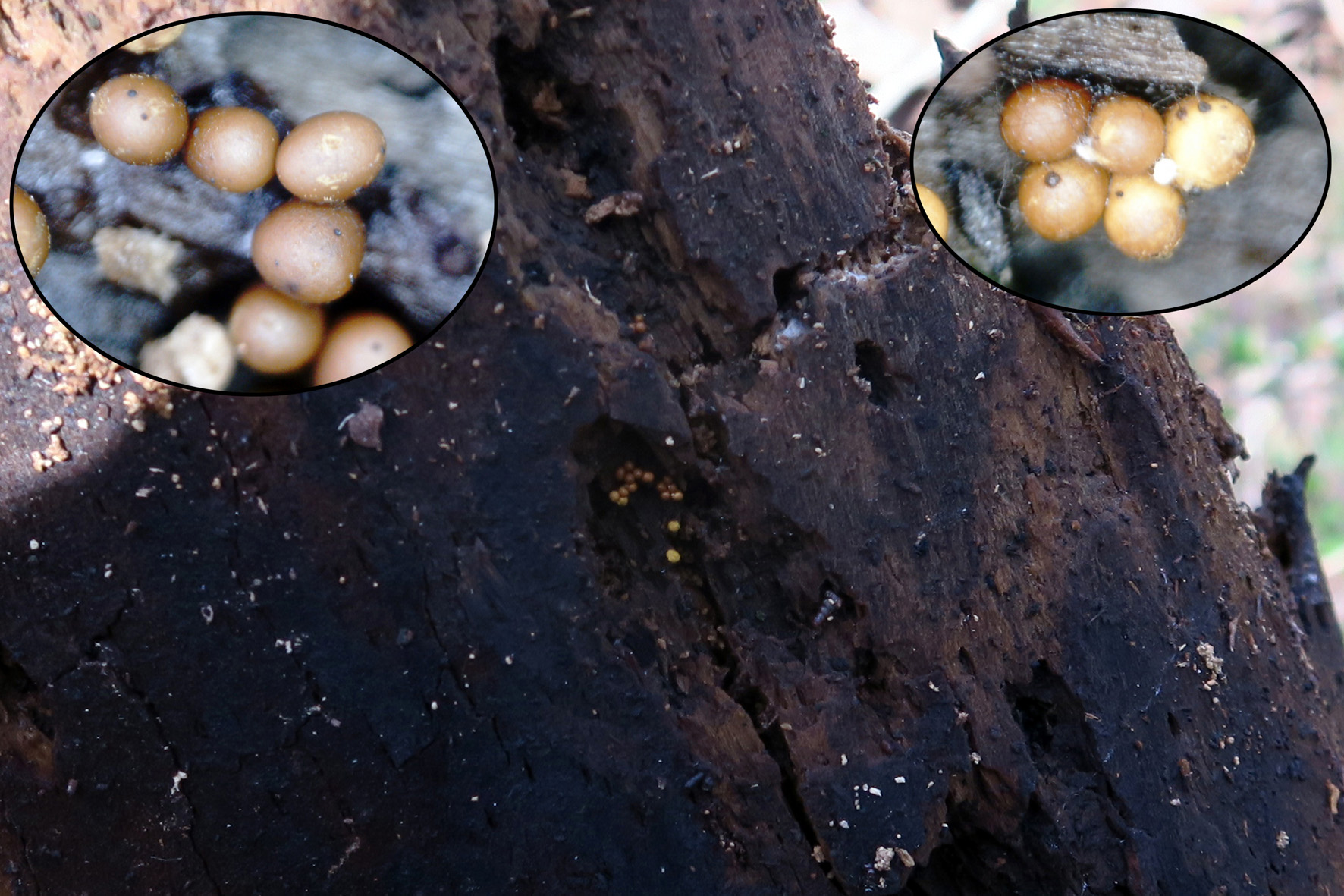 Esporóforos o esporangios de pequeño tamaño, ninguno llegaba a 1 mm., sesiles o con un pedicelio muy corto y diminuto, brotando de forma gregaria o aislada (aunque esta especie también se presenta frecuentemente en grandes colonias), de forma entre globosa y ovoide, de un color pardo amarillo y con esporada en masa de color amarillo.