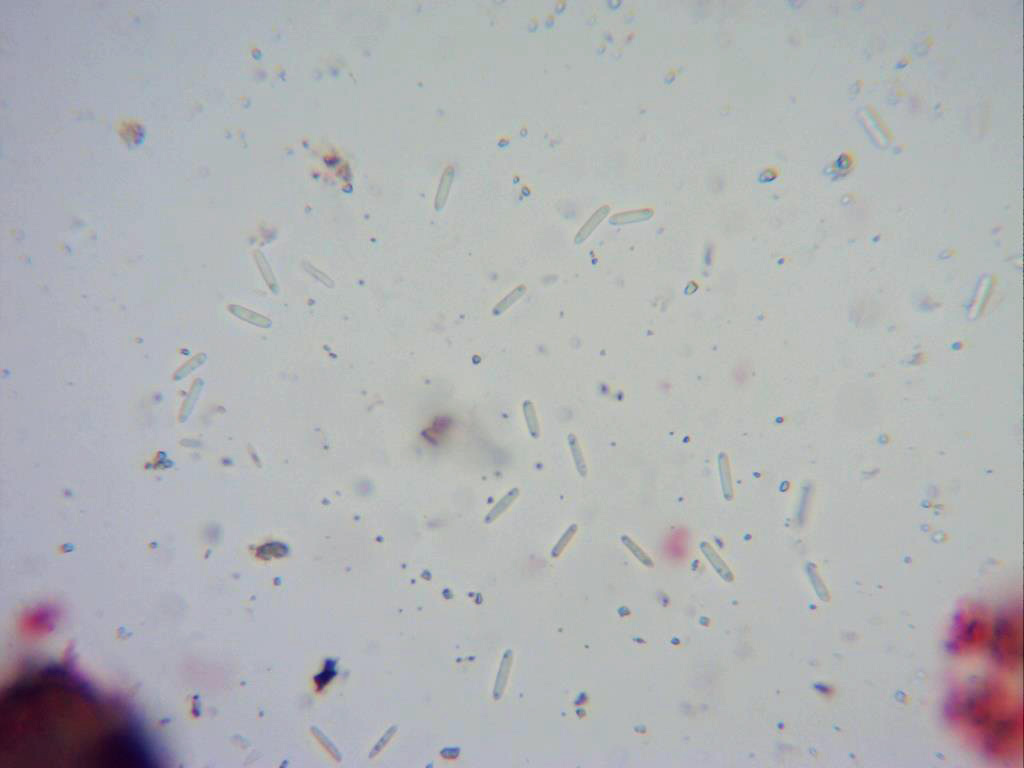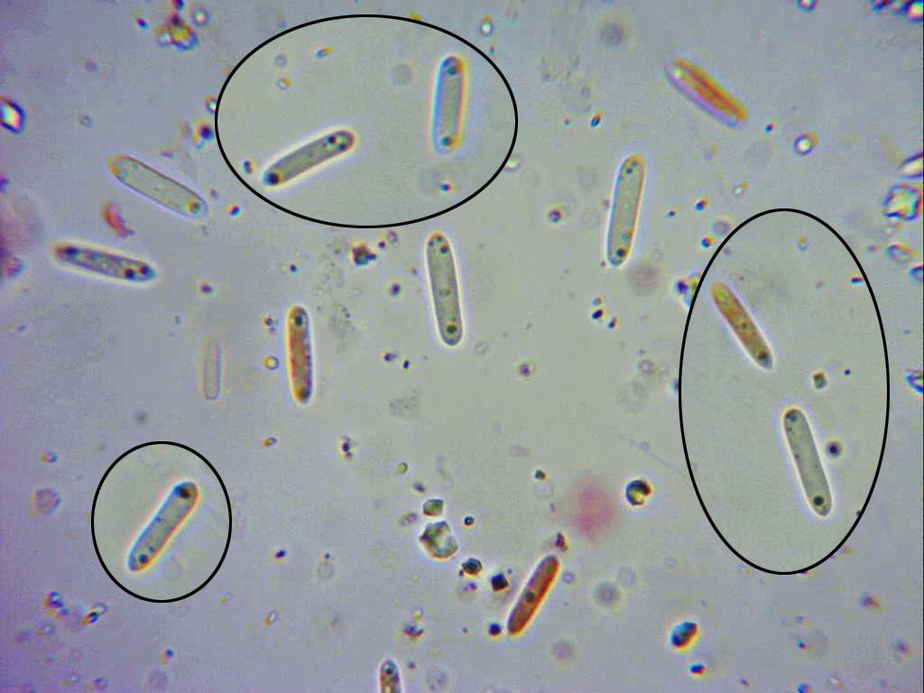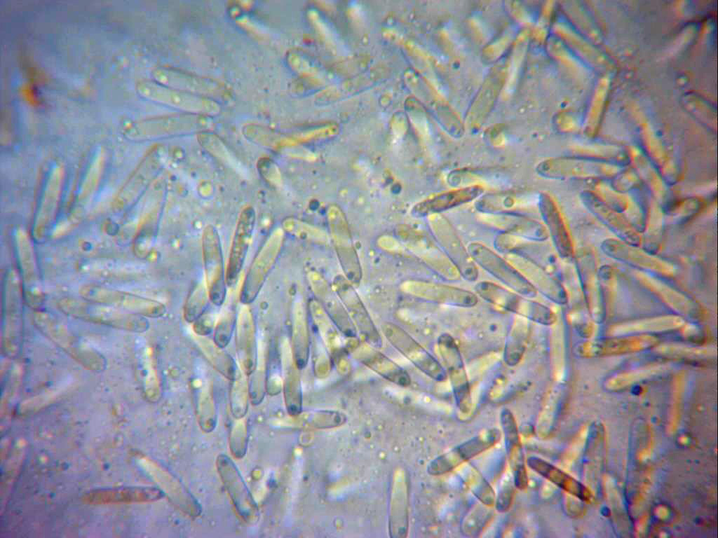 Conidios a 1000 aumentos, de forma alargada y con las puntas redondeadas, con unas pequeñas gútulas oscuras en su interior, preferentemente en sus extremos.