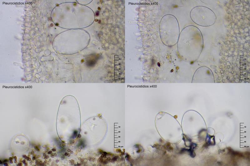 Pleurocistidios mayoritariamente ovoides o elípticos, generalmente de mayor tamaño que los queilocistidios, escasos.