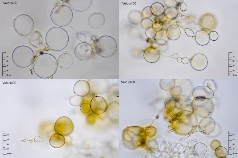 Velo formado por células globulosas, mayoritariamente hialinas, ocasionalmente coloreadas de color ocráceo, unidas a veces por hifas más pequeñas.