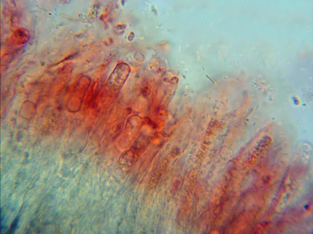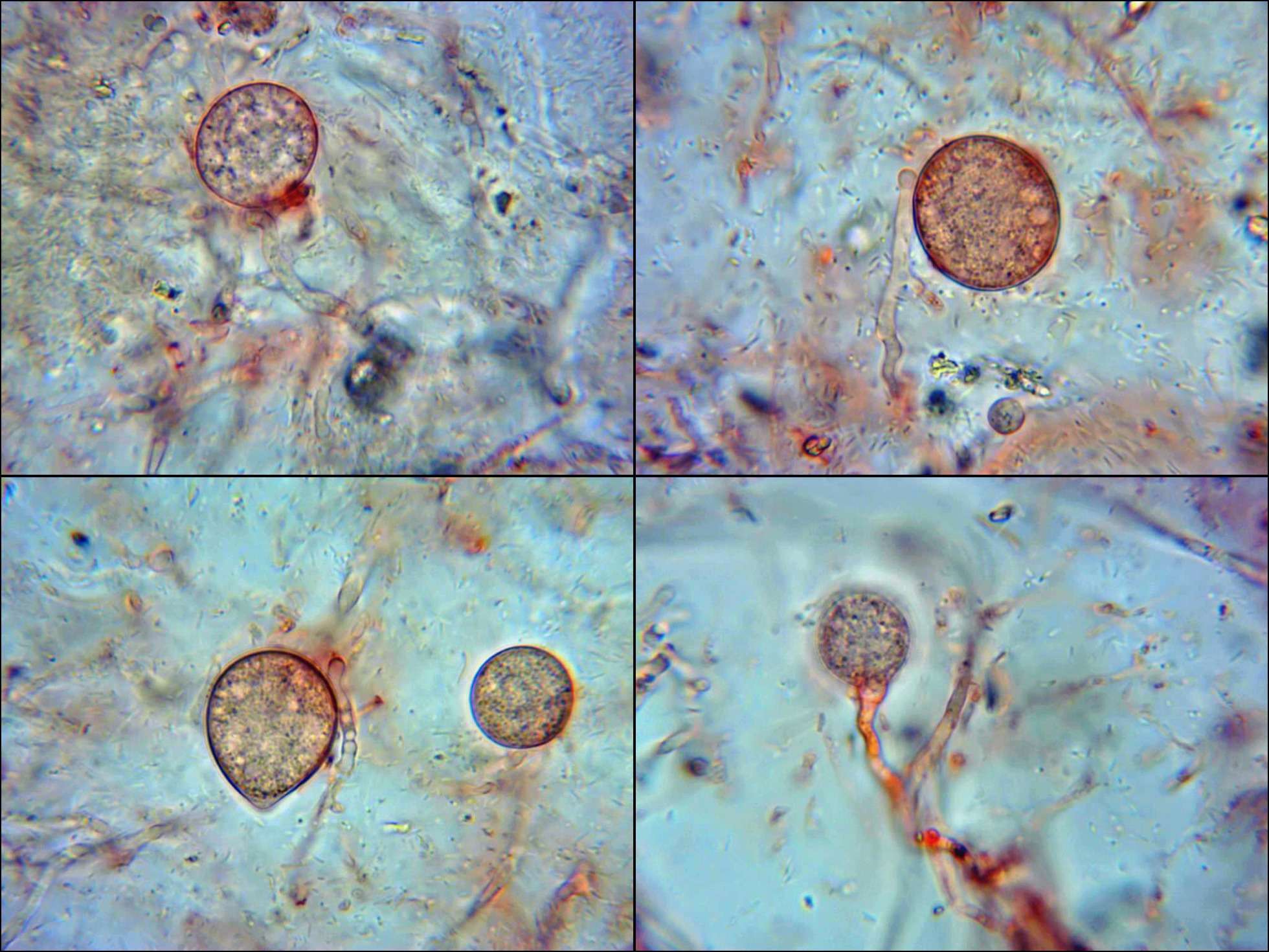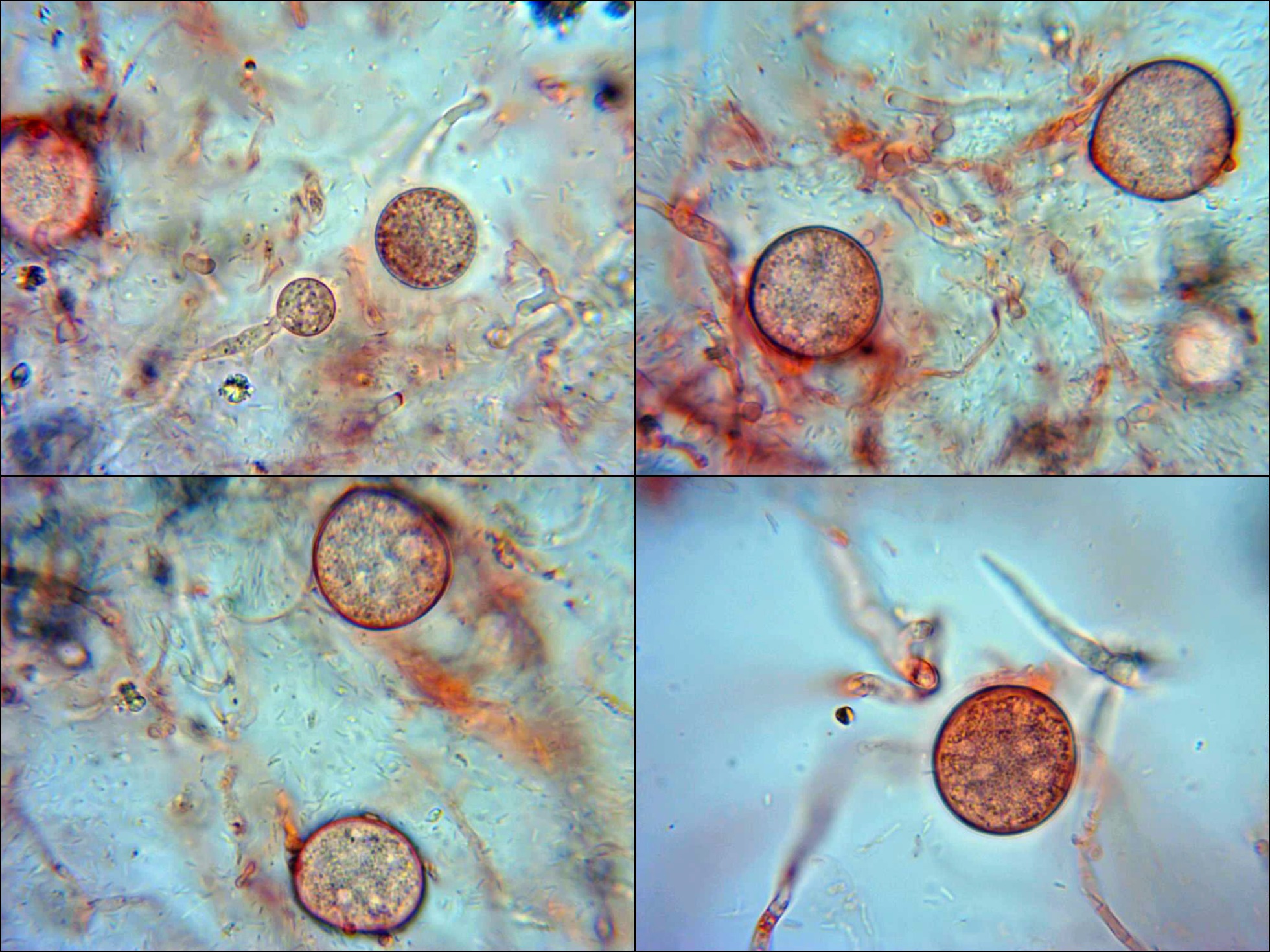 Basidios en solución de rojo congo diluido, al parecer sis tabiques, entre esféricos y ligeramente ovoides, de un tamaño bastante considerable, en mis mediciones de 20,9;26,5 X 18,5;25,1 micras.
