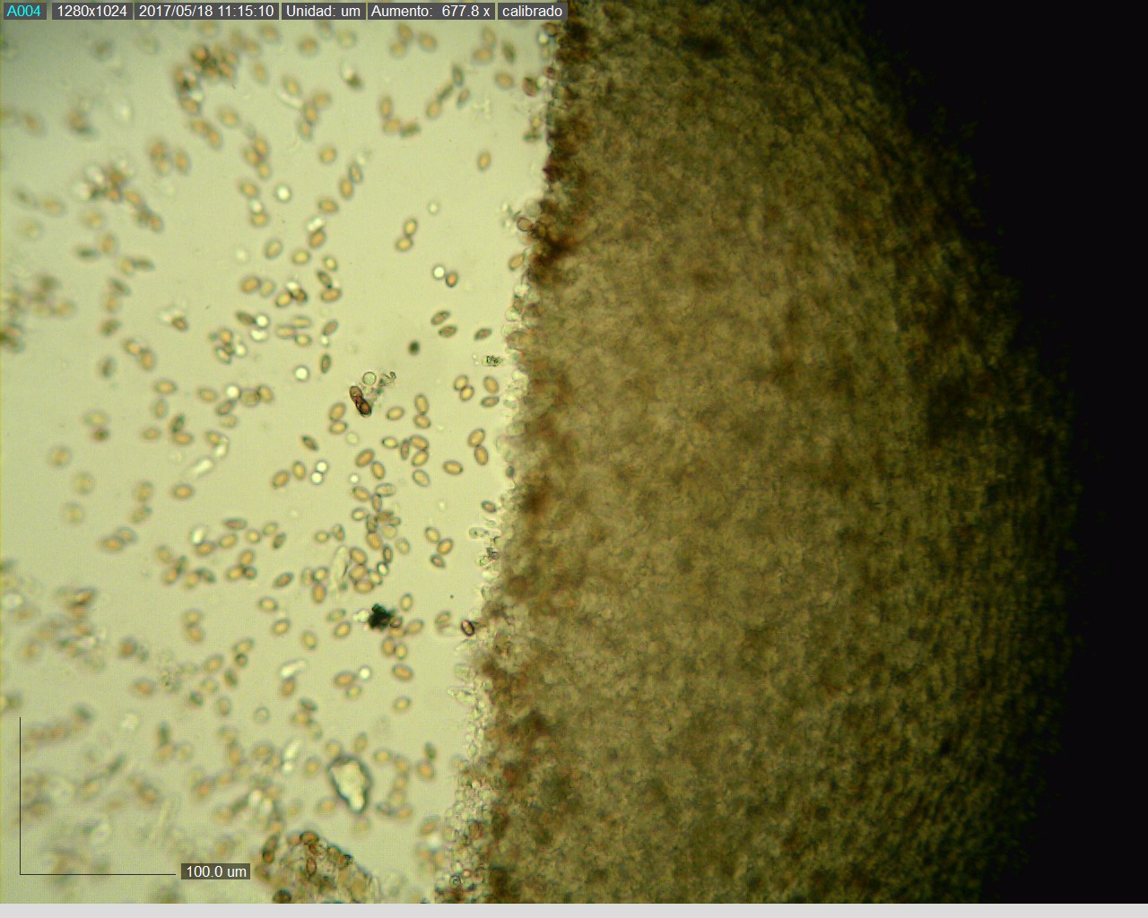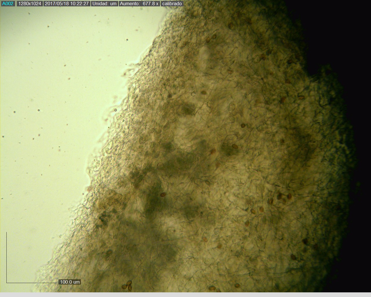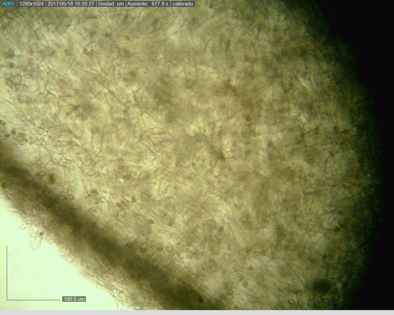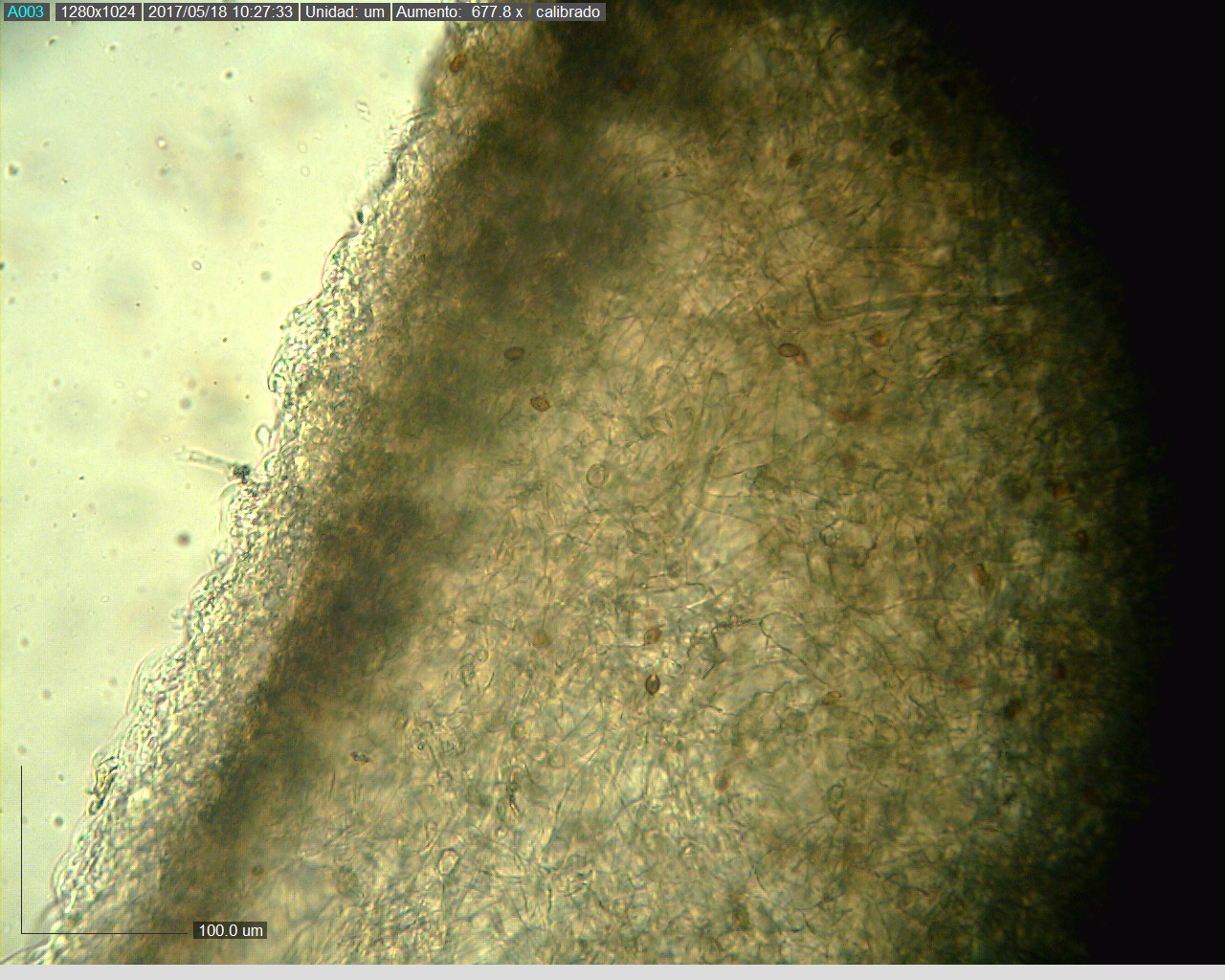 Vamos a ver si hemos progresado algo con los consejos de Koldobika, hemos hecho unos cortes radiales del sombrero para ver la pellis y de la arista laminar. Hemos utilizado un Agrocybe, A. dura, seguramente.