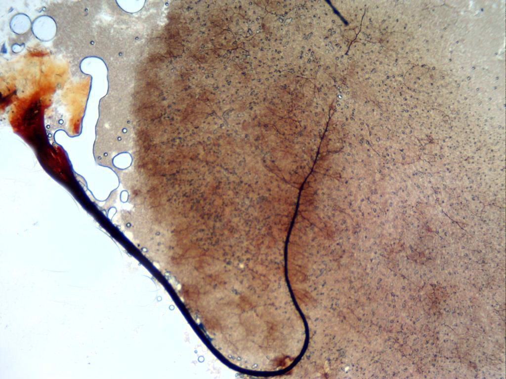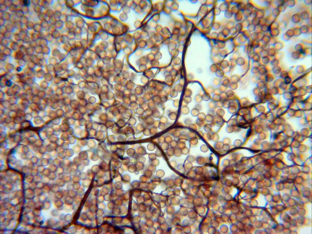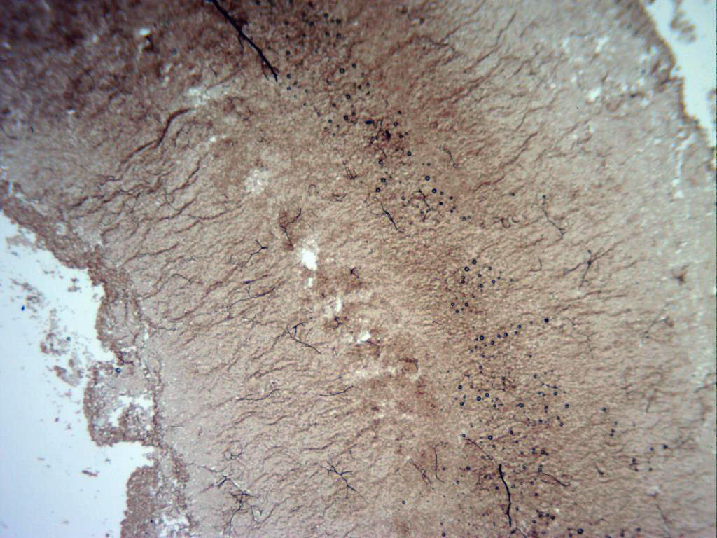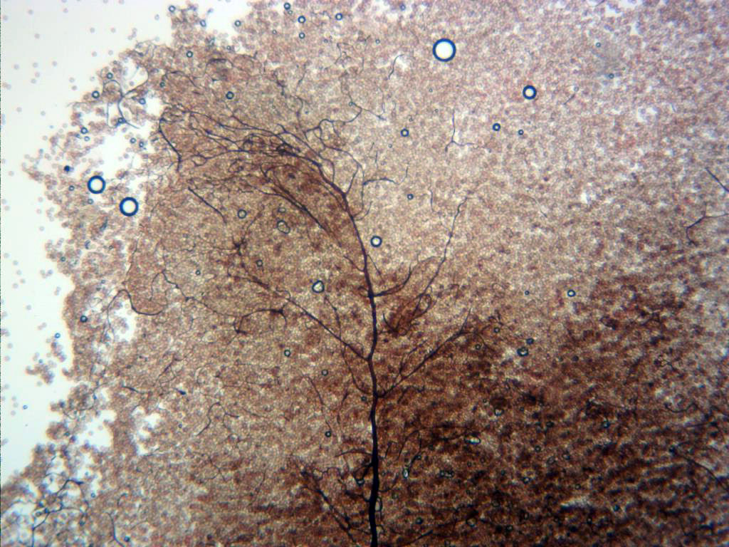 Capilicio a 400 aumentos, compuesto por hilos finos de color marrón, ramificados, flexuosos y muy fragmentados al acercarse a la superficie.