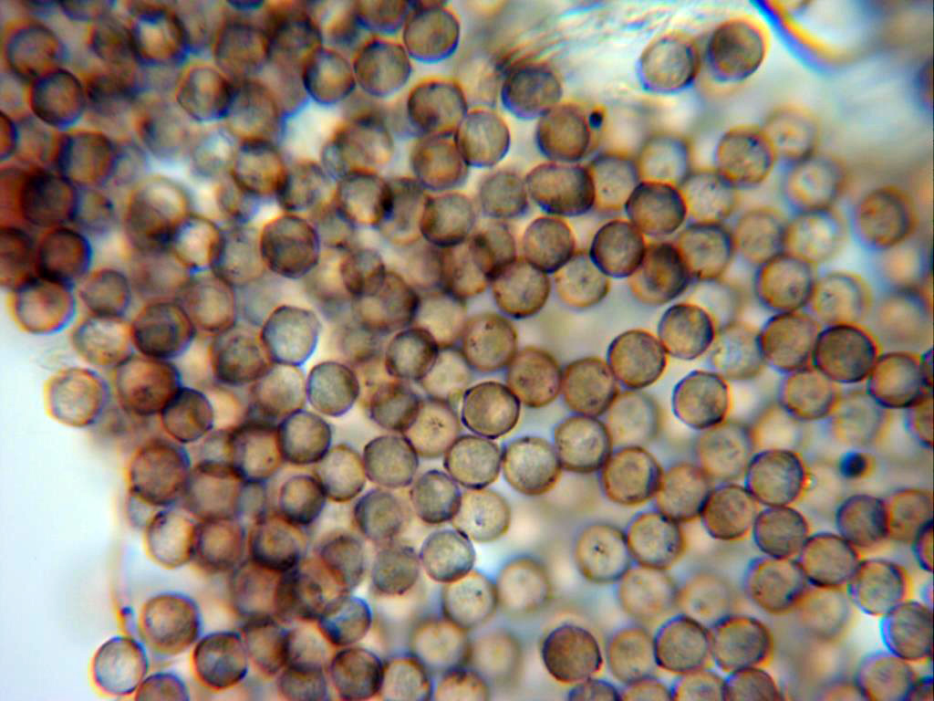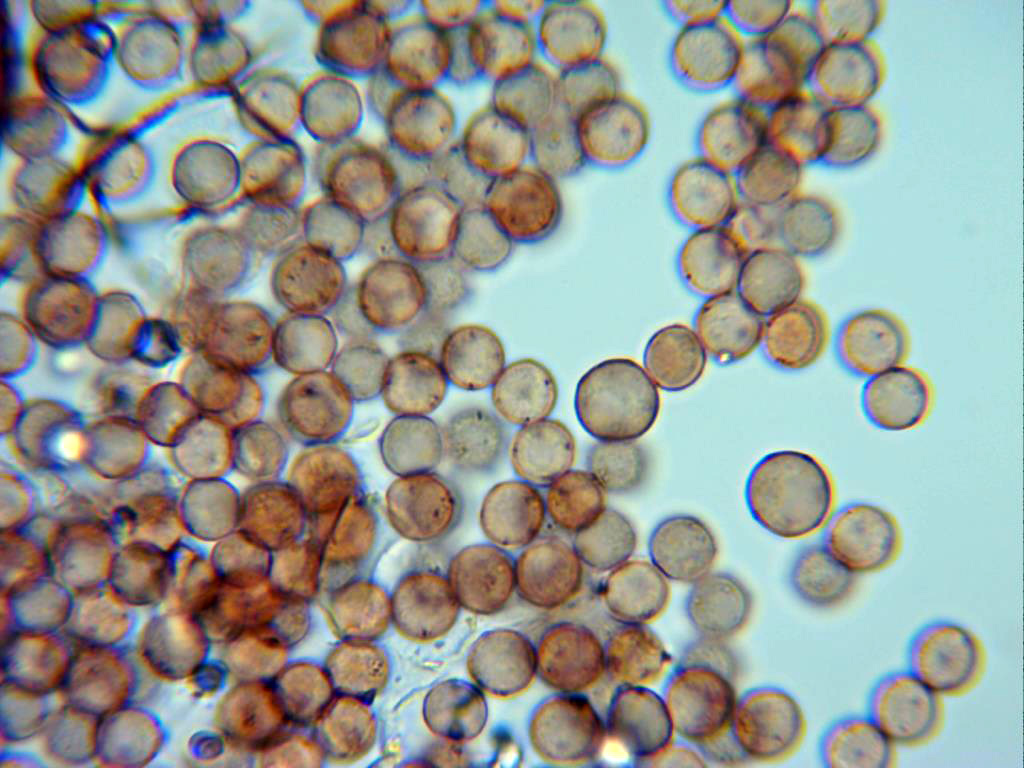Esporas globosas, timidamente verrucosas, detalle mas acusado en la pared de estas y con tenue contenido en su interior. En mis mediciones de 6,5 a 7,4 micras.
