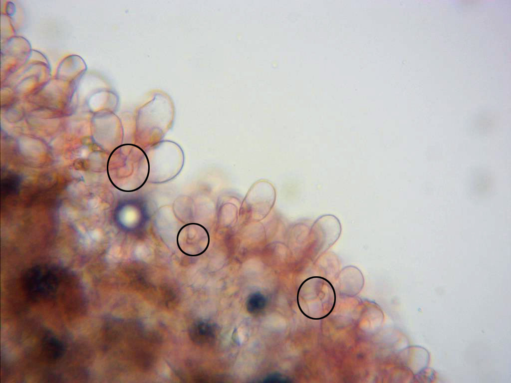 Gracias Ricardo, a mi me pareció claramente una fíbula ya que lo comprobé en el momento de captar la imagen modificando un poco en enfoque y se encontraba en el mismo plano. De todas formas he encontrado una imagen en mis archivos delos queiolocistidios a 400 aumentos, donde según mi parecer se observan fíbulas en la base de ellos.