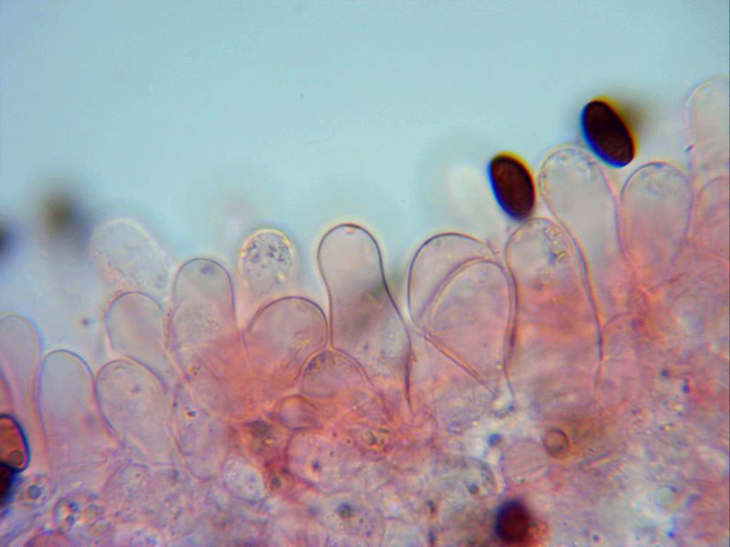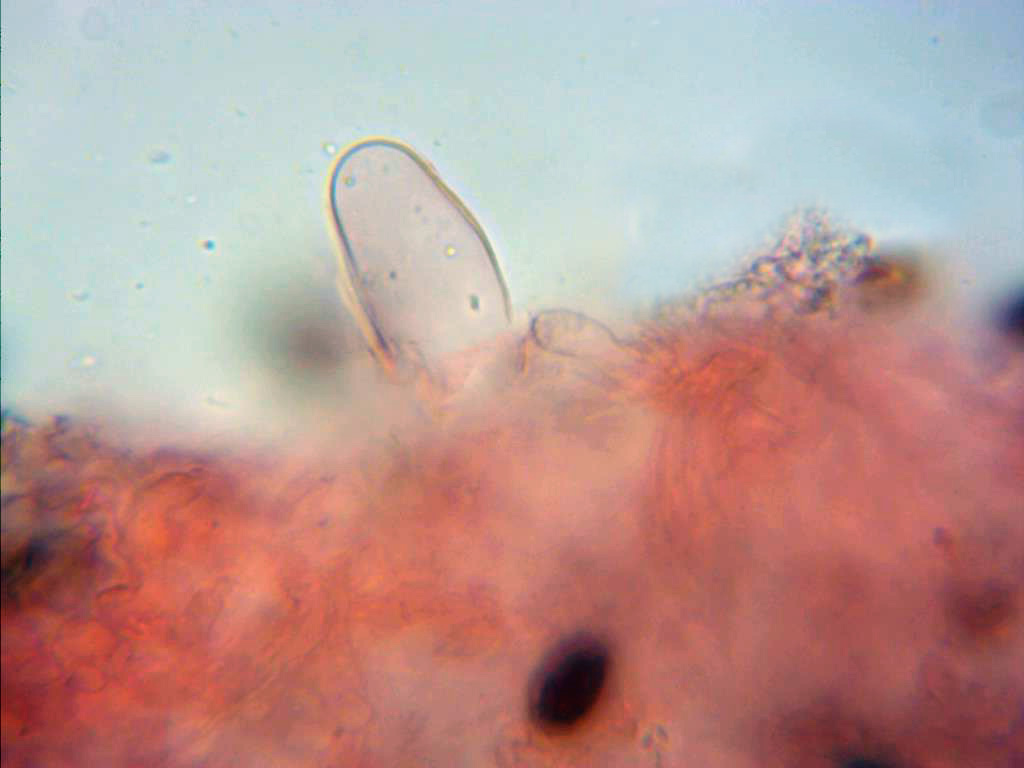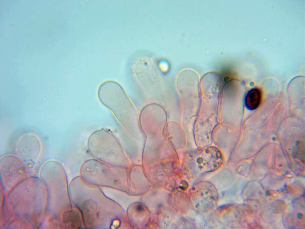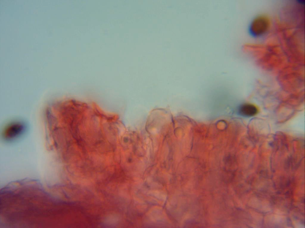 Hifas de la suprapellis, cutícula celulósica, de forma entre globosa, elíptica y piriforme, de un tamaño considerable, superando fácilmente las 30 y hasta 40 micras. No se observan pileocistidios en la cutícula.