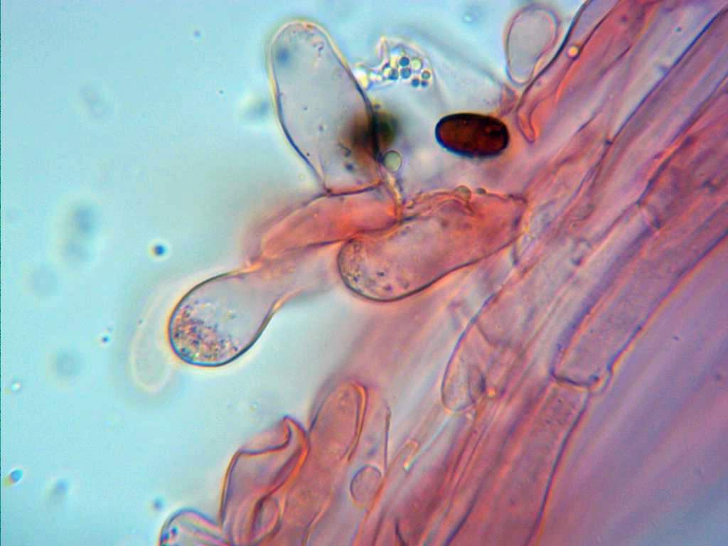 Un par de imágenes de los caulocistidios, presentes en la parte alta del pié, no hay mucha bibliografía sobre estos, aunque me he encontrado con un par de autores que si´los nombran.