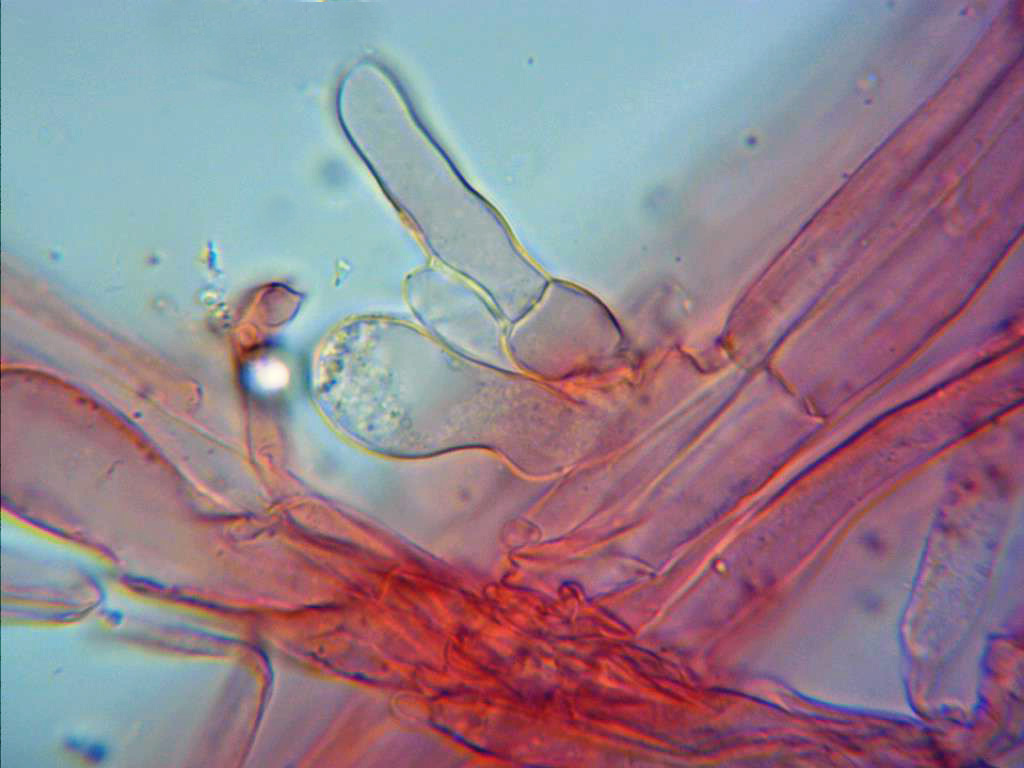 Basidios tetraspóricos, difíciles de observar, los de la imagen de entre 8,2 a 10,1 micras de ancho.