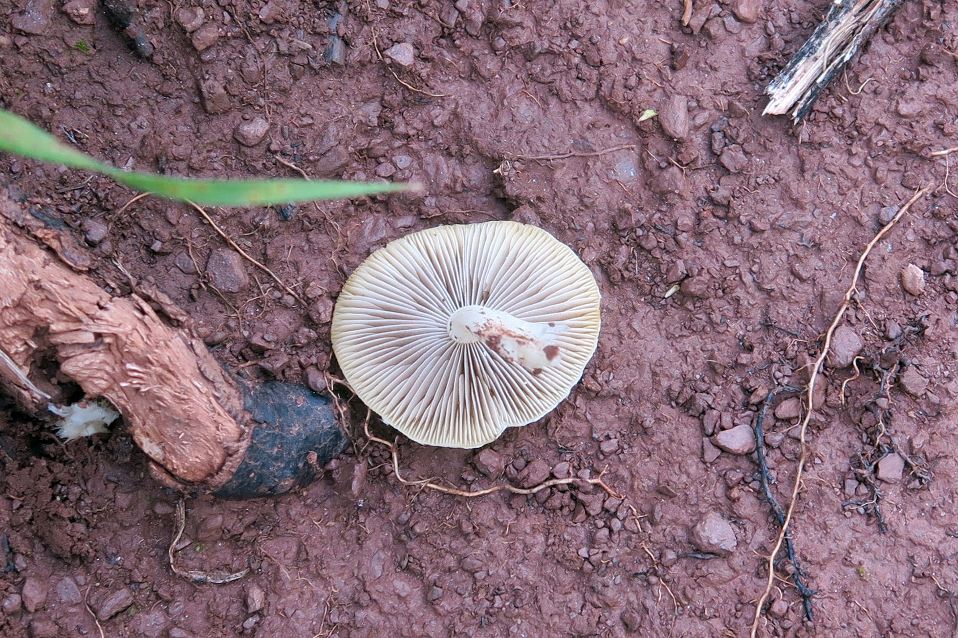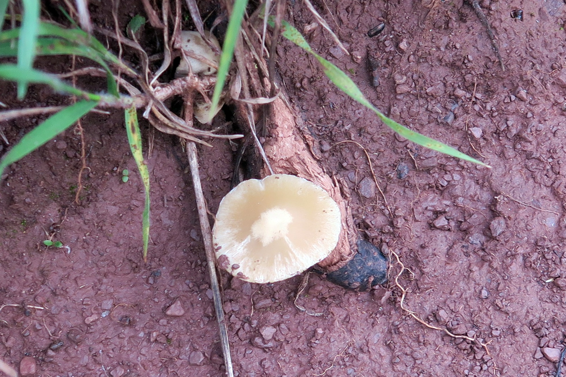Un único ejemplar, de poco mas de 2 cm. con sombrero de color marrón claro, muy higrófano, al secarse cambia a un color ocre muy claro.