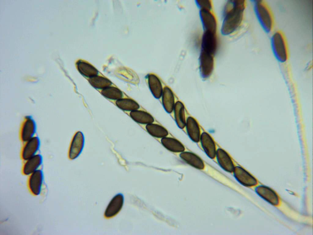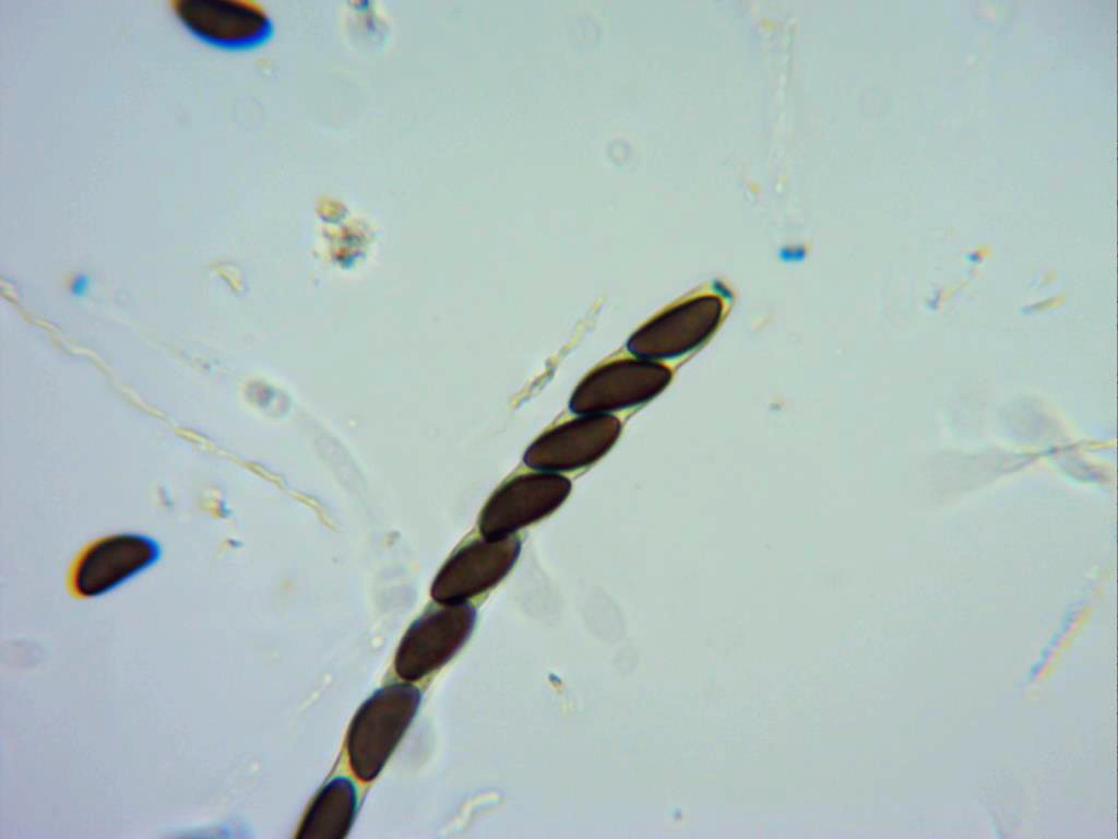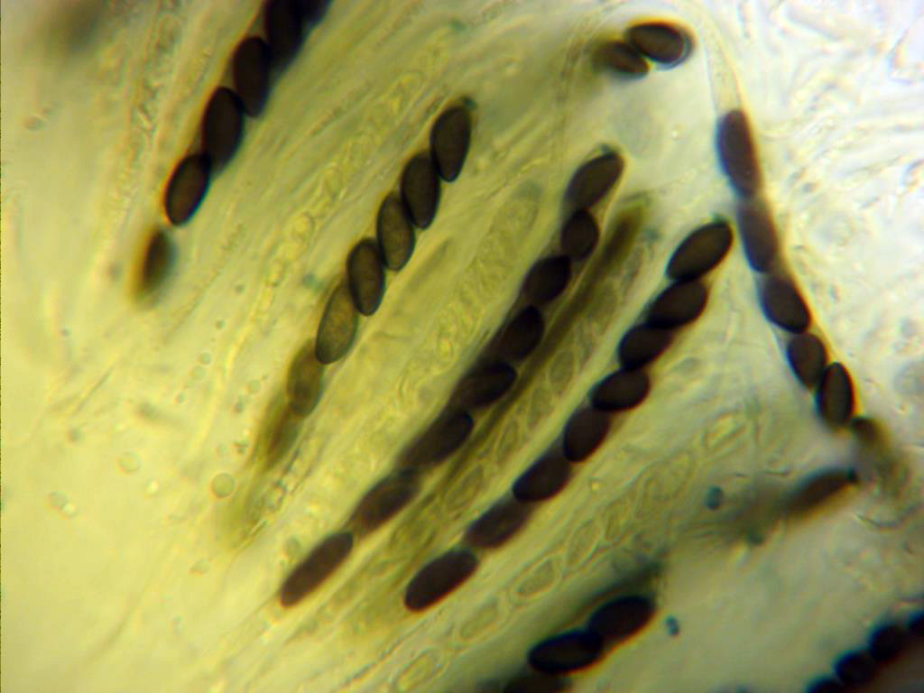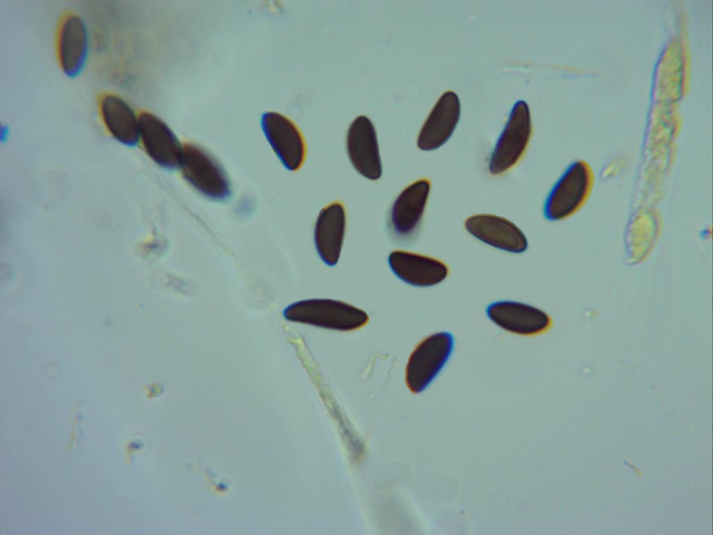Sus esporas, de color marrón oscuro, elipsoides, con un lado aplanado y con una hendidura rerctilínea poco visible. En mis mediciones de 9,6;12,9 X 4,4;4,7 micras. bastante acordes con la bibliografía consultada.
