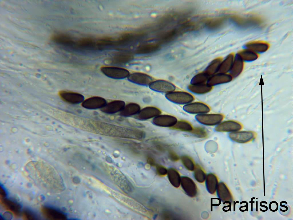 El Hypoxylon rubiginosum presenta unos paráfisos muy finos y de difícil observación con el micro, los he señalado en la última imagen.