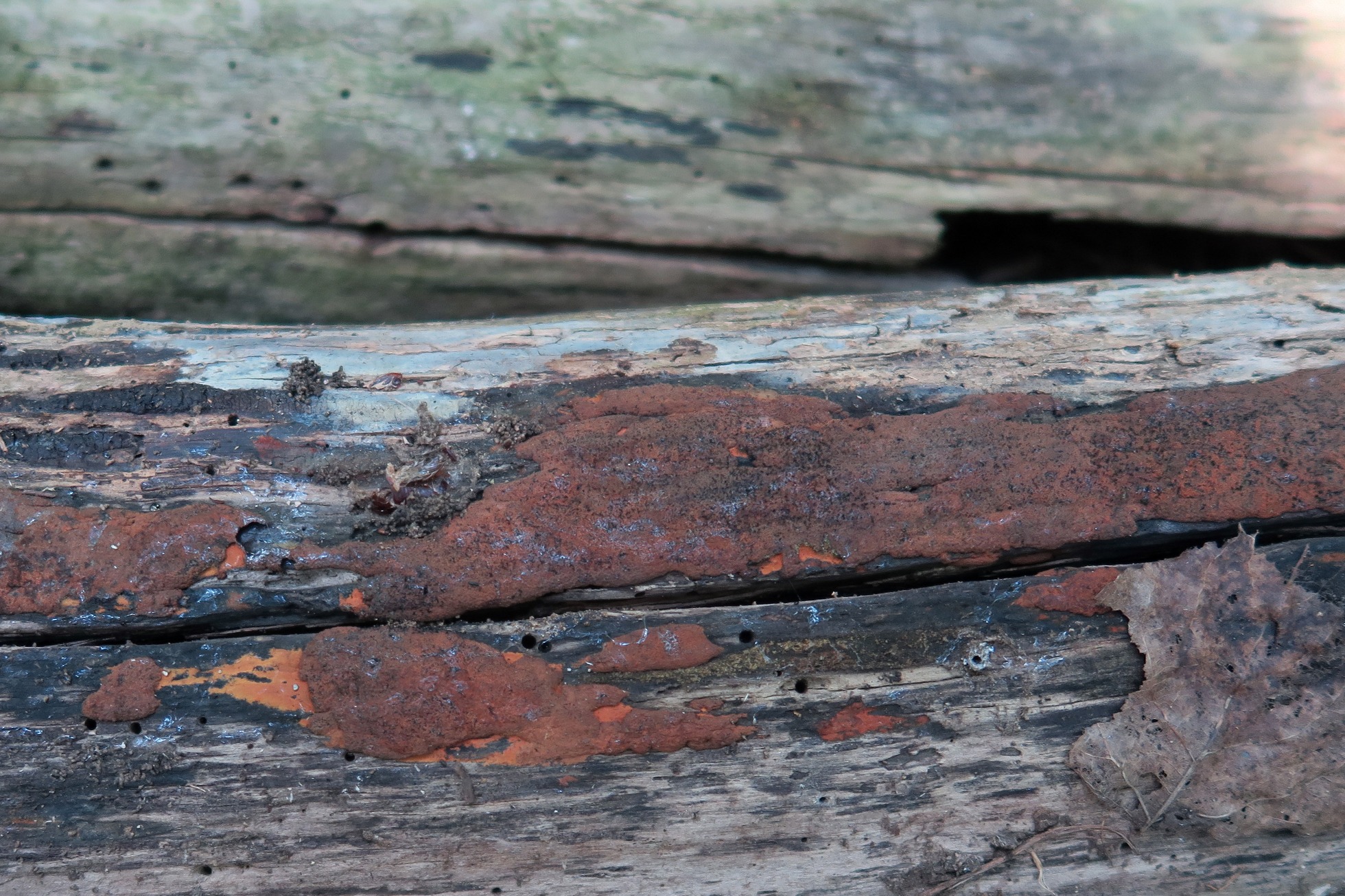 Estromas de varios cms. y de pequeño grosor (apenas poco más de 1 mm.), irregulares de color marrón óxido con el borde anaranjado.
