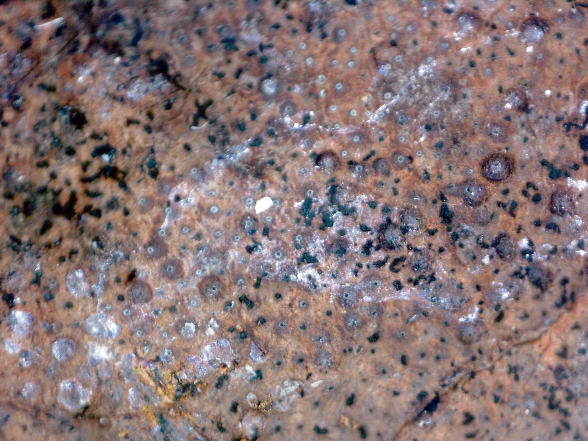 Peritecios a 100 aumentos, con gránulos de color anaranjado en su superficie, por debajo de estos presenta un tejido de color entre grisáceo y negro de 1 mm. de espesor.