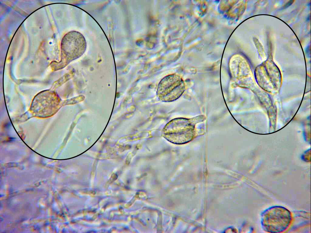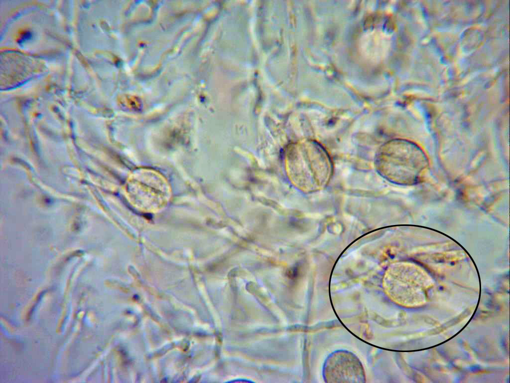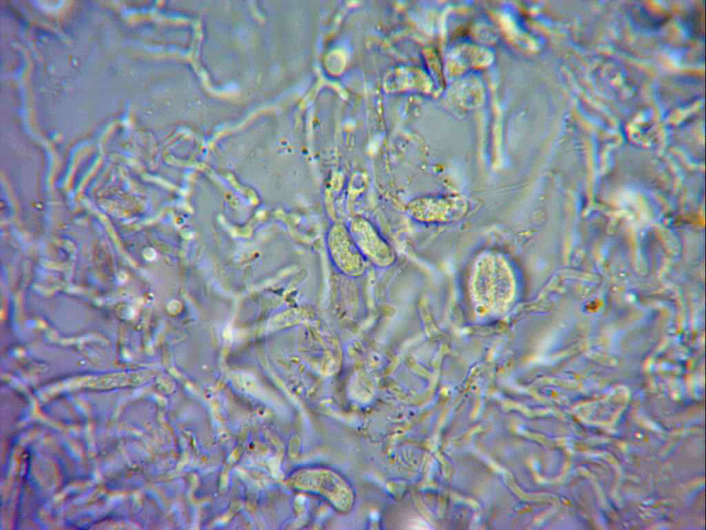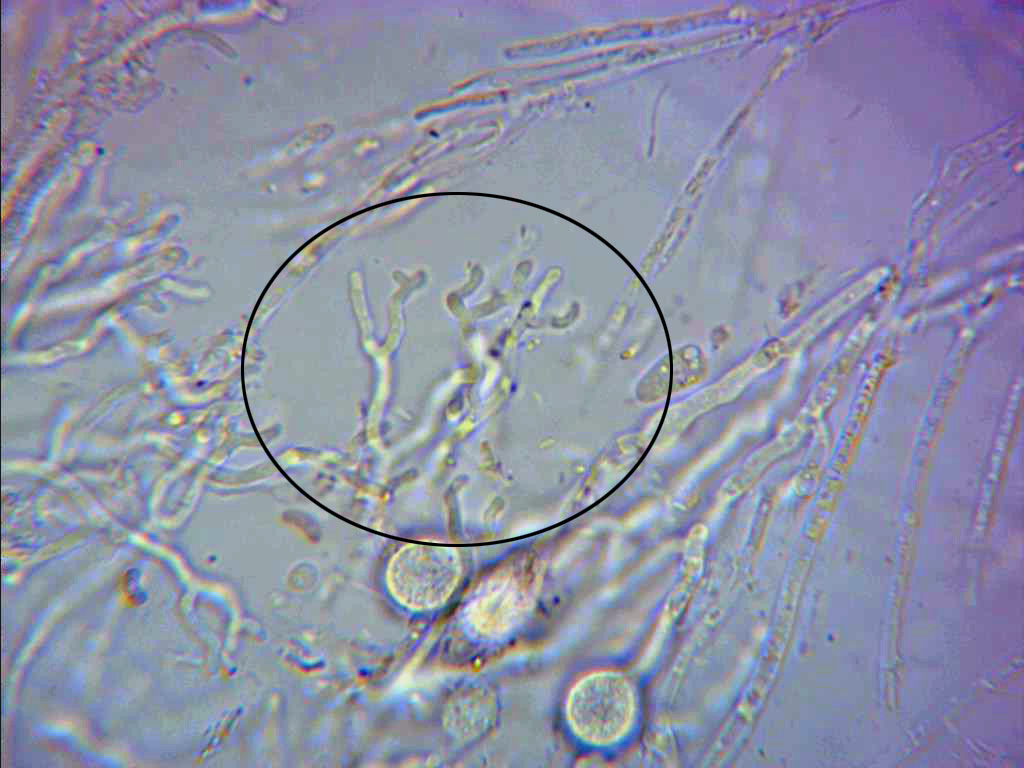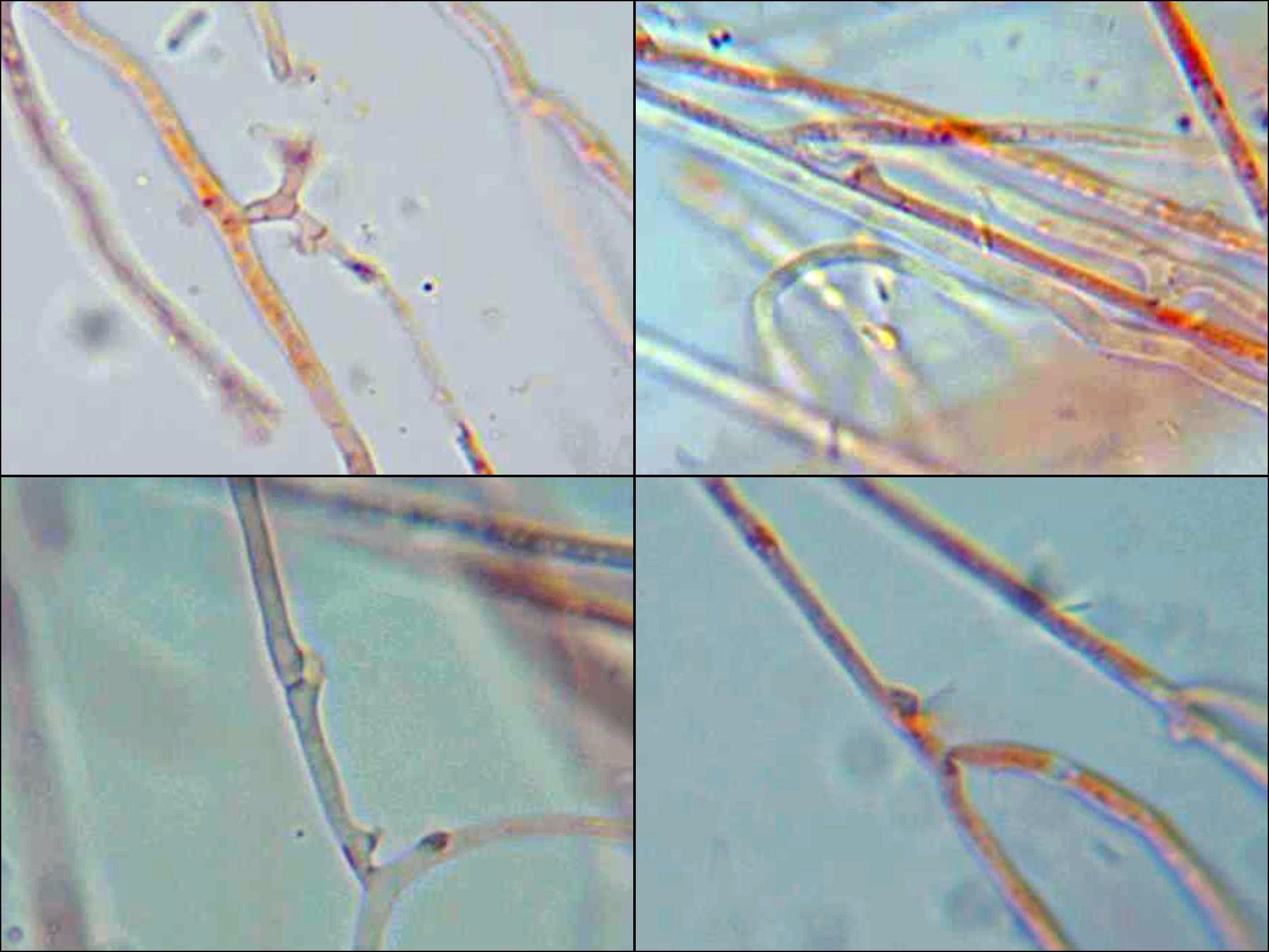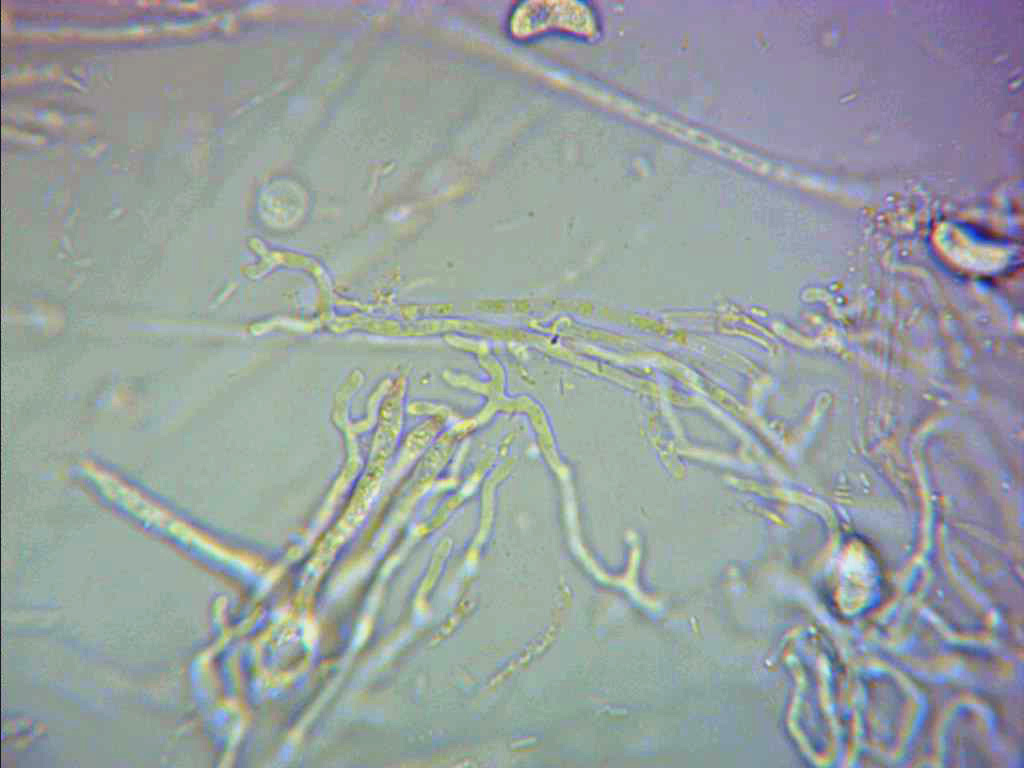 Hifas muy finas y separadas entre sí, de tan solo 1,5 a 2,4 micras, a menudo pigmentadas y provistas de fíbulas.