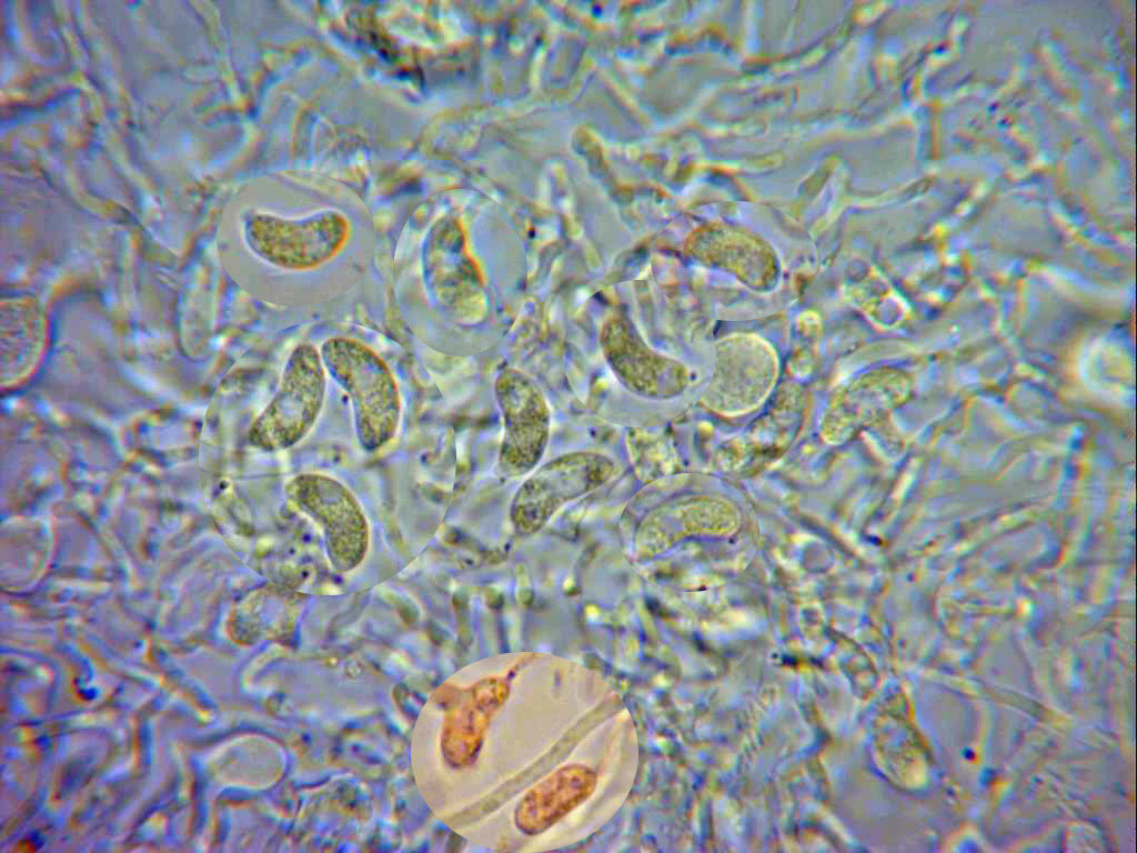 Me costó horrores el encontrar esporas aunque al final después de preparar varias muestras las encontré ya de manera generosa. La imagen es una composición de unas pocas.